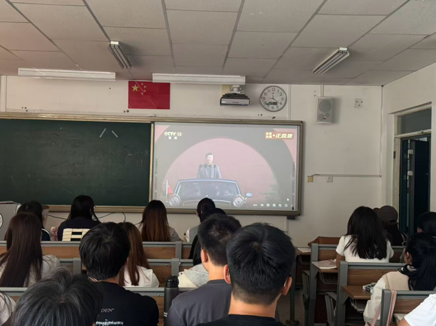 2025年9月3日9时30分,文学院积极响应号召,组织全院师生“集中观看+居家收看”相结合的方式同步观看纪念中国人民抗日战争暨世界反法西斯战争胜利80周年大会直播,共同回顾峥嵘岁月,感受胜利荣光。
