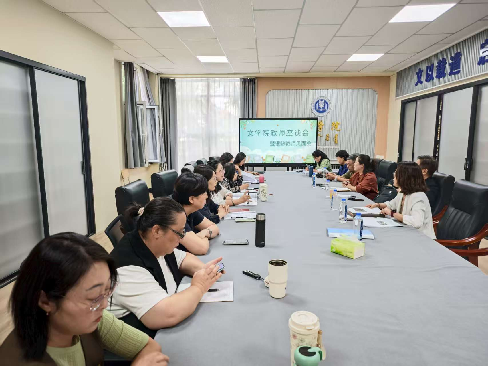 讲座开始前,曹道巴特尔教授与文学院全体教师在会议室围绕学科发展、科研合作及育人实践等议题展开深入讨论。