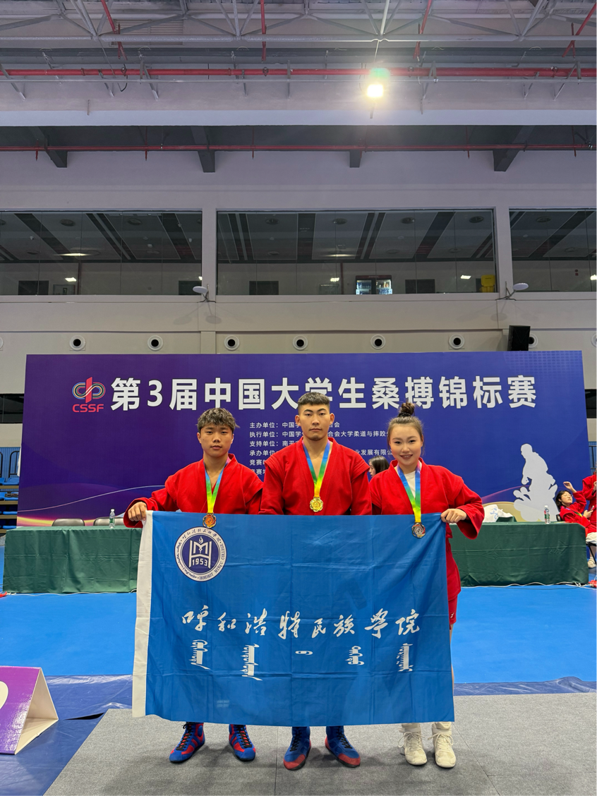 2025年11月14日,第三届中国大学生桑搏锦标赛圆满落幕。我院学子在赛场上奋勇拼搏、尽显风采,凭借精湛技艺与顽强意志斩获多项荣誉:2023级汉语国际教育班呼布琴同学勇夺98kg级冠军,2024级汉语国际教育班乌云腾同学摘得72kg级亚军,同班级的安其尔同学斩获71kg级季军!