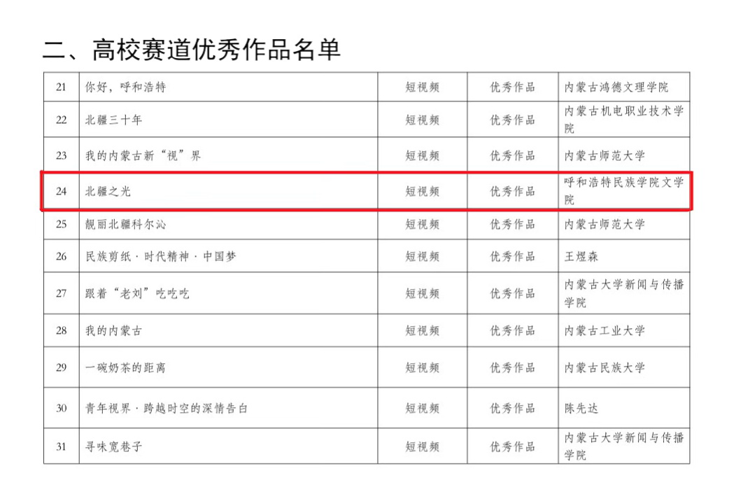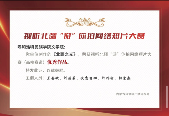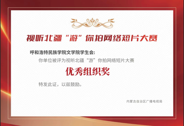 近日,由内蒙古自治区广播电视局主办的“视听北疆‘游’你拍”网络短片大赛评选结果正式公布,beat365英国官方网站文学院报送的作品《北疆之光》在高校赛道中获评“优秀作品奖”,同时荣获“优秀组织奖”。