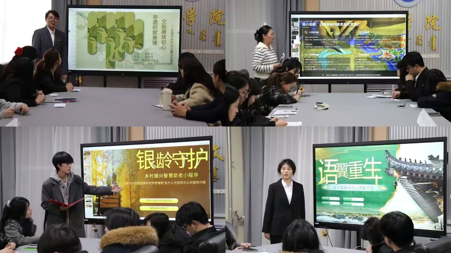 竞赛现场,各参赛团队依次登台路演,集中展示了非遗数字化传承、汉语言文化创新传播、校园服务平台建设、文化创意开发等多个领域的特色创业项目。参赛团队充分结合文学院专业优势,从市场分析、产品设计、商业模式、社会价值等维度全面呈现项目亮点。