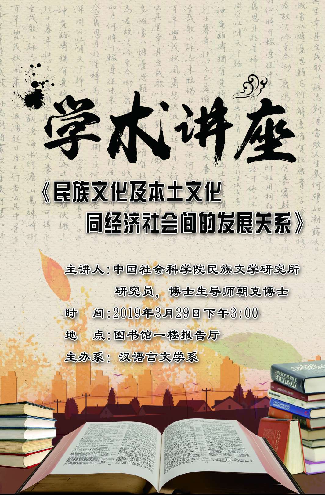 3月27日下午3点在图书馆一楼报告厅召开《民族文化及本土文化同社会经济发展的发展关系》学术讲座,请同学们提前15分钟入场,保持会场秩序,现场签到。