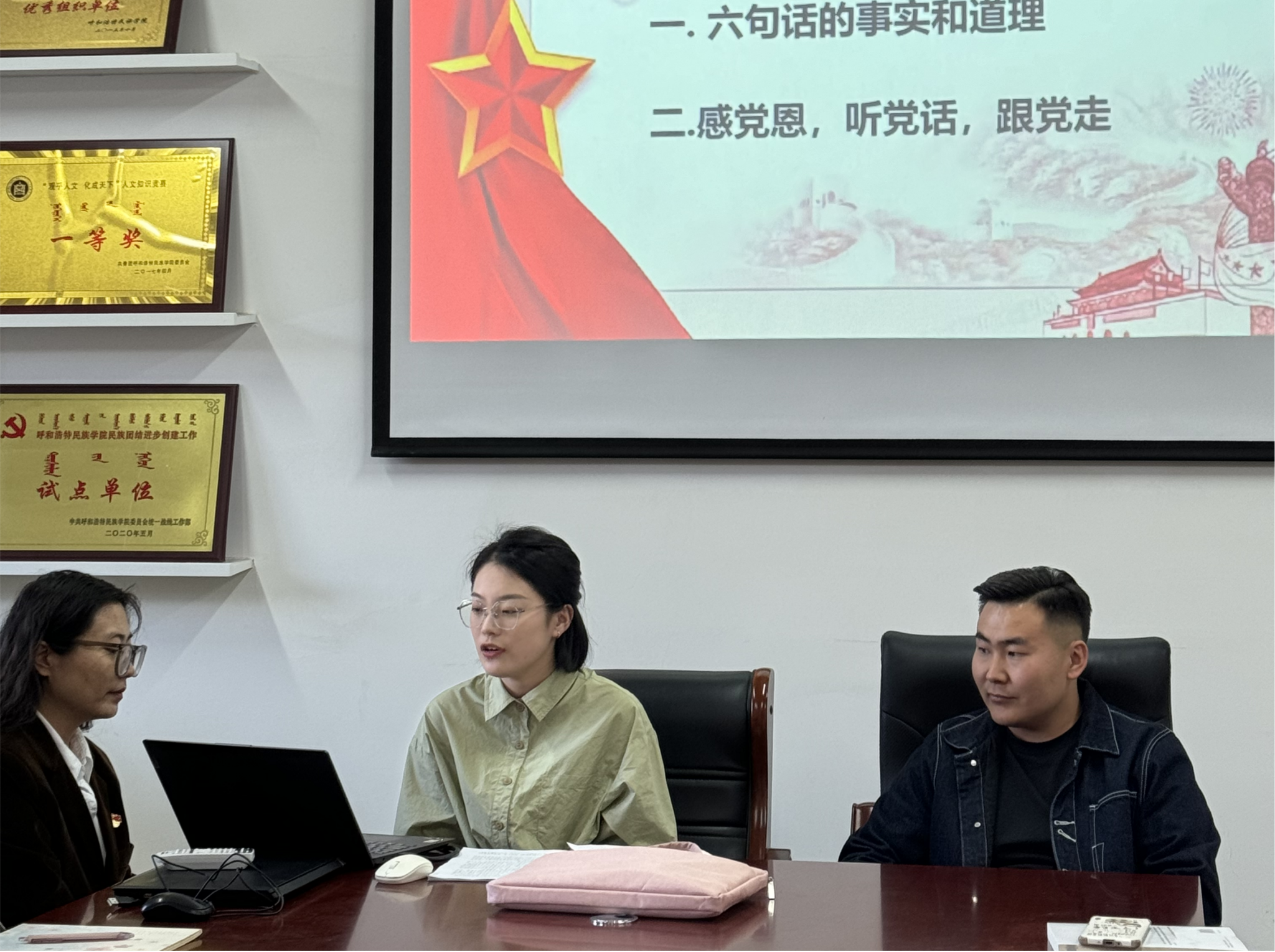 活动开始,团总支书记刘晓进行领学,内容紧贴实际、时代性强,凝练概括了习近平总书记和党中央对内蒙古各族人民的深情厚爱,讲述了内蒙古各族人民群众矢志不移听党话跟党走的光荣传统。随后宣讲人杜金欣以“感党恩,听党话,跟党走”为主题,分享了国立蒙藏学校的光辉历史,并讲述了陈祥榕同志的英勇事迹。