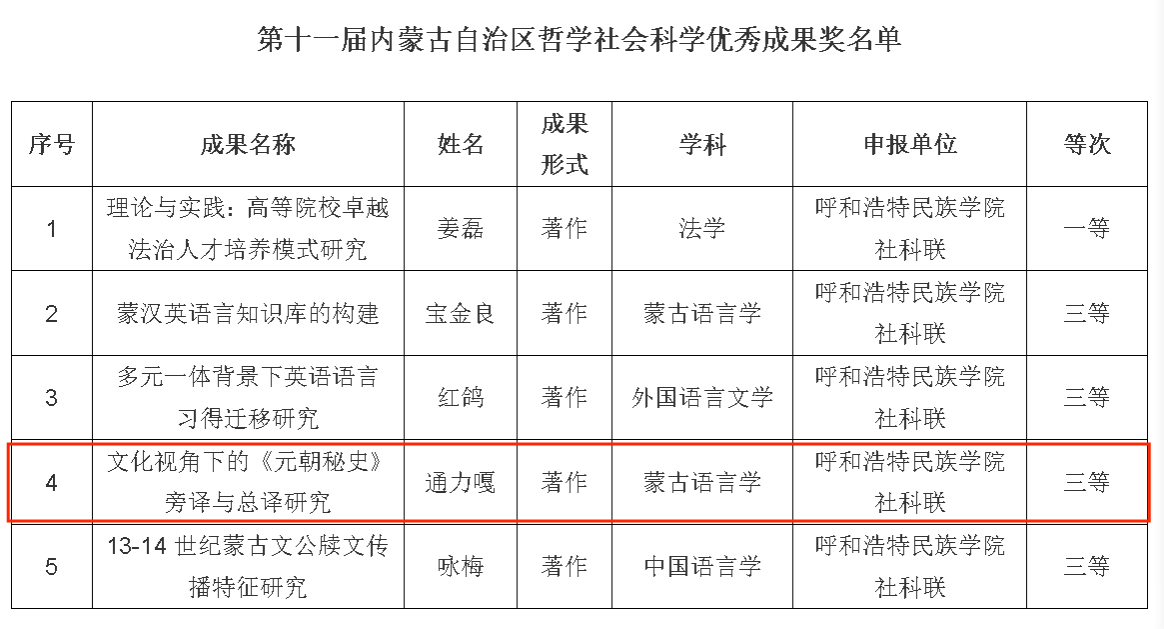 近日,内蒙古自治区社会科学界联合会正式公布第十一届内蒙古自治区哲学社会科学优秀成果奖评选结果。我院通力嘎老师的学术专著《文化视角下的<元朝秘史>旁译与总译研究》凭借深厚的学术价值与创新的研究视角,荣获三等奖。该专著是通力嘎老师2022年主持的国家社会科学基金项目《文化视角下的〈蒙古秘史〉旁译与总译研究》的最终研究成果,以优秀等级顺利结项。