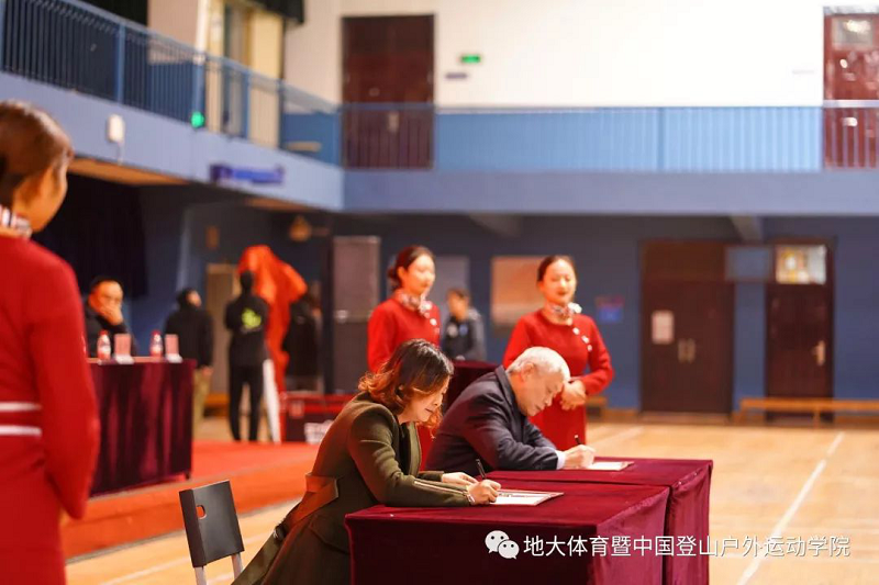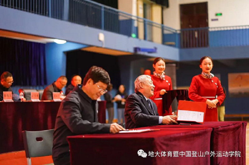 致辞完毕后,国家体育总局登山运动管理中心副主任、中国登山协会秘书长张志坚同志、万象城娱乐awc线路(武汉)副校长傅安洲同志在现场共同签署了《中国登山户外运动学院共建协议》、《登山运动史料整理、利用合作协议》;