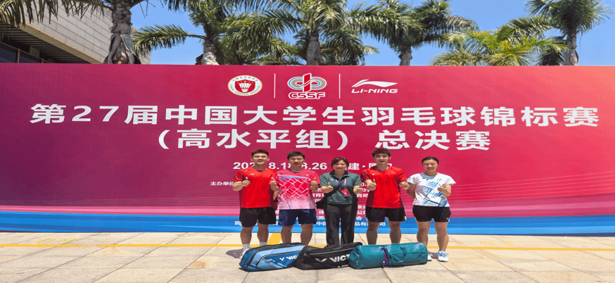 2025年8月18日-25日,第27届全国大学生羽毛球锦标赛(总决赛)在福建厦门杏林体育馆举办。万象城羽毛球队由邹师思老师带队,荣获高水平组男子双打第五名,实现了新的突破。