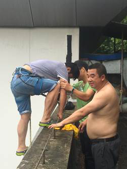 外面暴雨如注,馆内有如水帘洞。突击队借助梯子爬上攀岩馆屋顶,查明了漏水原因:由于长时间没有清理,树叶堵塞了下水口,致使屋顶排水沟积水无法下流而漏入馆内。几位同志冒着大雨小心翼翼地走在湿滑的、没有栏杆的铁皮屋顶上,寻找每一个下水口,然后趴着用手把树叶清理干净,积水很快排尽,攀岩馆漏水的问题解决了。