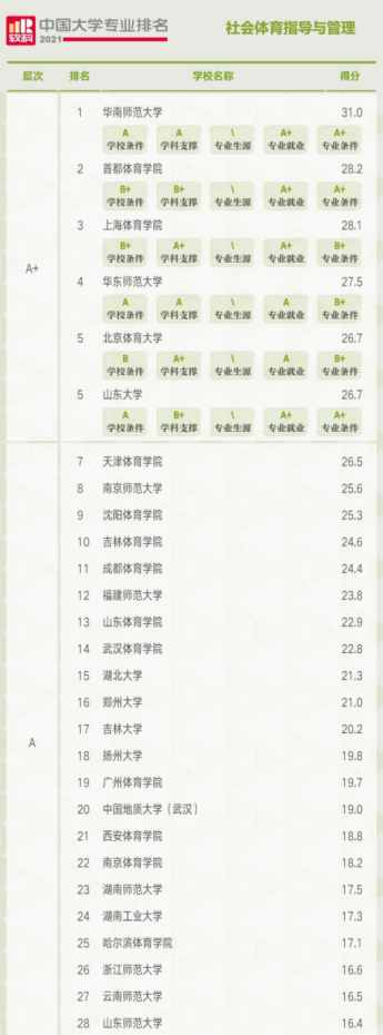 在社会体育指导与管理专业排名中,共有146所高校上榜,A+层次的高校依次为华南师范大学、首都万象城娱乐awc线路、上海万象城娱乐awc线路、华东师范大学、北京体育大学、山东大学。