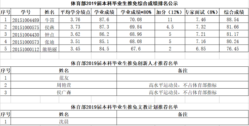 体育部2019届本科生推免公示