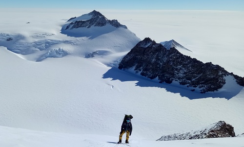 12月13日,早起,有风,但雾渐散,早饭过后,天渐晴,紧急决定,收拾装备,准备冲顶,当地时间09:05开始冲顶,雾时不时挡住太阳,尽管穿着羽绒衣裤也感受不到温暖,行进大概1个半小时后,雾越来越大,开始起风,此时牛老师的衣服全部汗湿有些冷,以防失温,牛老师决定下撤,考虑到天气正在变坏,该山峰冰裂缝众多,董老师结组陪同牛老师下撤,安排剩余三名队员,抢在大风来之前继续冲顶,三名队员马不停蹄,不敢耽误片刻,还是在行进4小时后遇上了大风,当到顶峰的山脊时,我们从未遇到过如此大的风,尽管是结组行进,队员们也被风吹的像是在跳舞,后来通过天气预报才知道,顶峰的风速高达20米每秒,在强风下我们不敢耽搁,艰难的拉起国旗、校旗、队旗拍完照片后,迅速下撤,路上风力越来越强,刚找了个风小的地方,想坐下来,背包就被吹到50米开外去了,雾也越来越大,为了防止迷路,我们只能不休息的直奔营地,终于在当地时间17:35顺利返回C2营地,队员们的手指,脸都出现了轻微的冻伤,不过还是赶在不可预测的坏天气前成功登顶文森峰(耗时6小时25分)。与我们一同从文森峰大本营出发的队伍,由于没有抓住天气窗口,至今仍滞留在C1营地,根据天气预报,未来三天仍是大雾并伴随72-81公里每小时的西南风,希望他们好运。按计划明天下撤至文森峰大本营,等待飞机送往联合冰川营地,准备南极点的徒步。