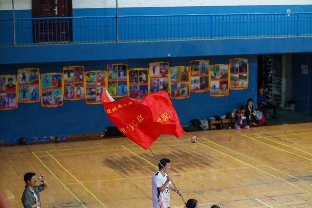 场馆内气氛热烈非凡,材化学院的学生们敲响锣镲,手持院旗随着加油节奏有力挥舞;地信学院的同学们挥舞院旗,将大鼓架在场边,鼓手每一次擂鼓都震得空气发颤,呐喊声与鼓声交织。此起彼伏的口号声、欢呼声,让赛场更加火热。