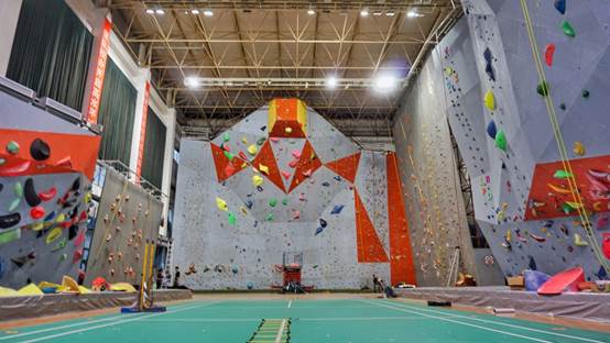 万象城娱乐awc线路(武汉)攀岩馆岩壁最高15米,两边13米,最长屋檐5米,小屋檐3米半,国际标准速度赛道和速度赛岩壁,高15米,倾斜度15°以及8组标准抱石墙。岩馆内配备一间专业的训练房,在训练房里有大斜板、大屋檐、直板、自制的指力板等一系列的专项技术练习的场地。目前是国家攀岩集训队、湖北省攀岩队的训练场地,也是国内高校最为专业和完备的攀岩馆。
