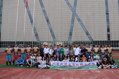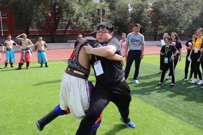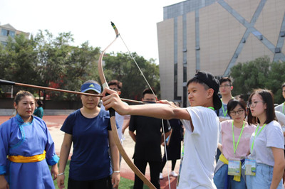 香港青年会书院一行到达beat365官网后,首先在综合楼十二楼会议室与beat365官网师生举行了座谈,beat365官网胡春梅副书记向交流团介绍了beat365官网概况,应交流团要求向他们教授了蒙古语日常用语。随后,交流团赴学校校史馆参观并到演播厅欣赏了马头琴表演。最后,交流团一行到学校操场体验了博克、射箭、布鲁等蒙古族传统体育项目。