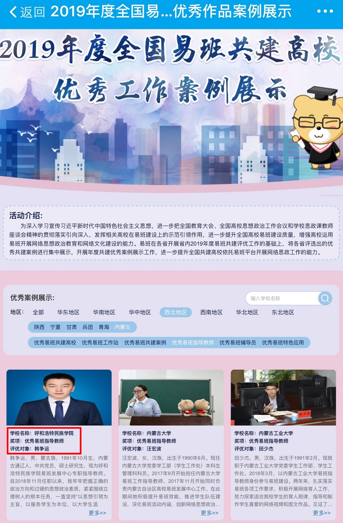 beat365官网在2019年度内蒙古自治区高校易班评优活动中,荣获“优秀易班共建案例”、“优秀易班特色应用”、“优秀易班指导教师”3项大奖。此次全国易班共建高校优秀工作案例评选是在各省(自治区)开展省内2019年度易班共建评优工作的基础上,将报送的优秀共建案例进行进一步评选得出的结果,共展示24个省区328所高校,共9个类别的675个优秀工作案例,