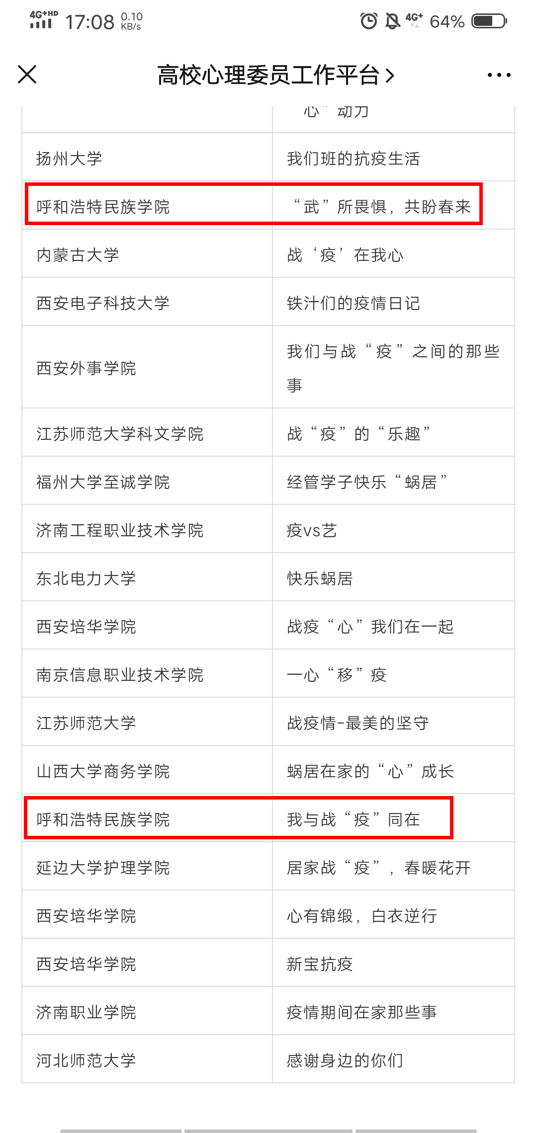 beat365官网学生工作部积极组织各二级学院参与活动。该活动经过中国心理学会心理危机干预工作委员会专家、全国高校心理委员研究协作组理事们的精心评审。beat365官网《战“疫”舞动》、《“武”所畏惧,共盼春来》、《在家“抗疫”的日子》、《我与战“疫”同在》四部作品入选优秀作品。