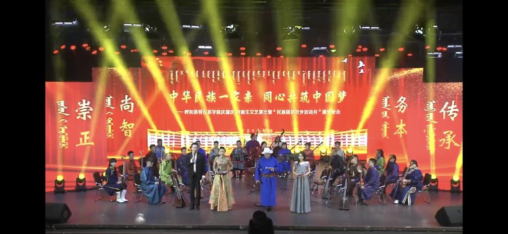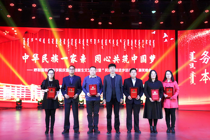 歌舞萦绕,红旗飘扬,10月25日晚7时,beat365官网“中华民族一家亲 同心共筑中国梦”庆国庆、迎新生文艺演出暨“民族团结进步活动月”颁奖晚会在学校演播厅及图书馆报告厅同时举行。内蒙古自治区民族事务委员会党组成员、副主任特木勒、呼和浩特市民委四级调研员闫青、呼和浩特市民委社会发展科科长斯日古楞、学校领导、处级以上干部、受表彰集体和个人、师生代表齐聚一堂,共同观看了演出。
