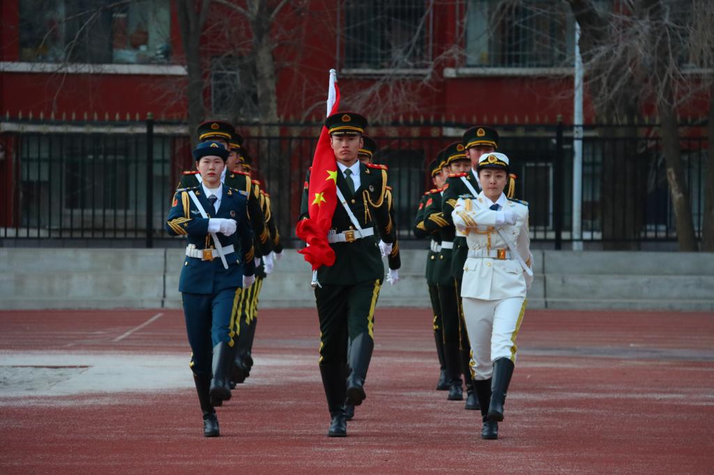 身着绿色戎装的国旗护卫队,踏着矫健的步伐,由运动场西南角缓缓入场,护送五星红旗走向升旗台。伴着雄壮有力的国歌声,升旗手振臂一挥,鲜艳的五星红旗冉冉升起。全体师生肃然而立,向国旗行注目礼,表达着对祖国的无限热爱和崇高敬意。随后,由马健、赵冉等同学进行了“国旗升起来”的演讲活动,铿锵有力的表达,无不诉说着作为中国人的骄傲与自豪,以及为祖国的繁荣富强贡献自己的青春力量的豪迈志向。