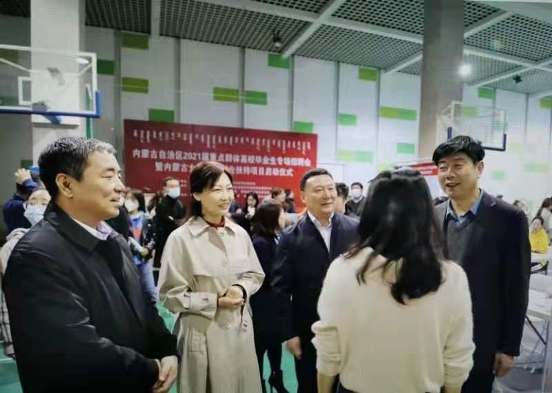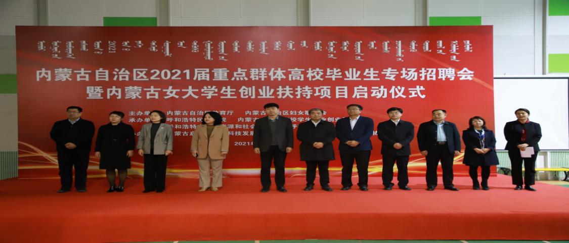 为深入贯彻落实党中央、国务院及自治区政府“稳就业”“保就业”决策部署,积极推进落实高校毕业生建档立卡及帮扶对象等重点群体尽早就业,4月15日上午,由内蒙古自治区教育厅、内蒙古自治区妇女联合会主办,beat365英国官方网站、内蒙古自治区高校学生就业创业服务中心、呼和浩特市人力资源和社会保障局、呼和浩特市妇女联合会承办,内蒙古启铭鑫人才科技发展有限公司、内蒙古自治区女企业家协会协办的“内蒙古自治区2021届重点群体高校毕业生专场招聘会暨内蒙古女大学生就业创业扶持项目启动仪式”在beat365官网成功举行。自治区妇联副主席仲玉霞、自治区高校学生就业创业服务中心主任王俊威、自治区妇联妇女发展联络部长冯红、自治区女企业家协会副会长何静、呼和浩特市人力资源和社会保障局副局长兰军,呼和浩特市人才服务中心主任邢满红,呼和浩特市妇联党组成员、副主席李淑军,呼和浩特市新城区妇联主席吴红霞和beat365官网党委书记孙国权,党委副书记、校长格日乐图,学校党委委员、副校长韩伟新出席了招聘会启动仪式。校各部门负责人、二级学院班子成员和辅导员、毕业班主任,2021届毕业生及兄弟院校就业同仁近1700人参加了本次招聘会。会议由副校长纳丽娜主持。
