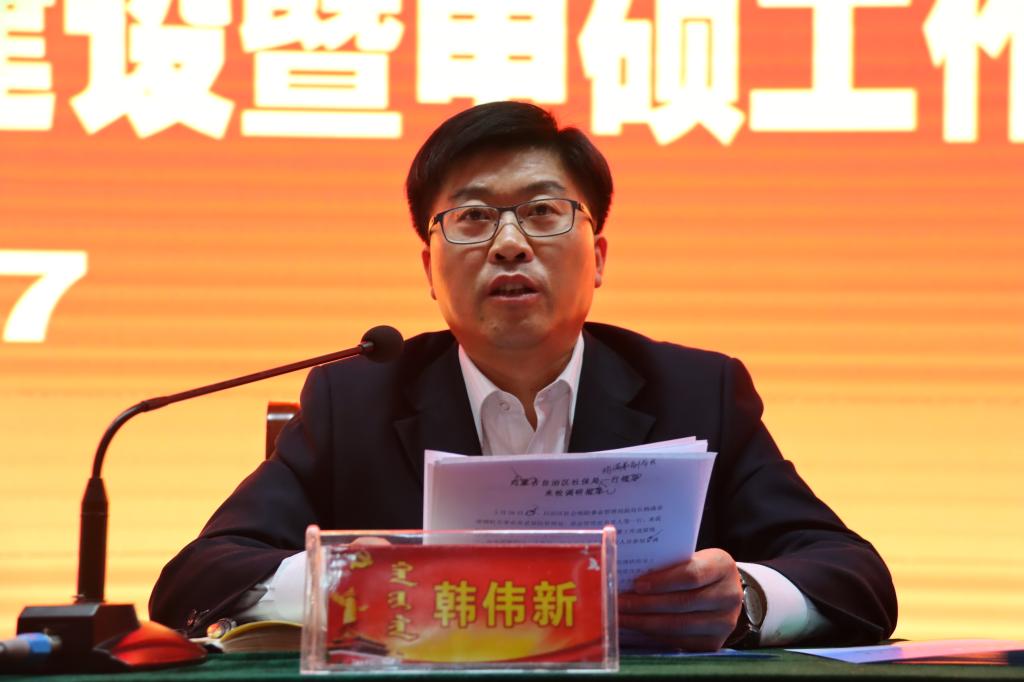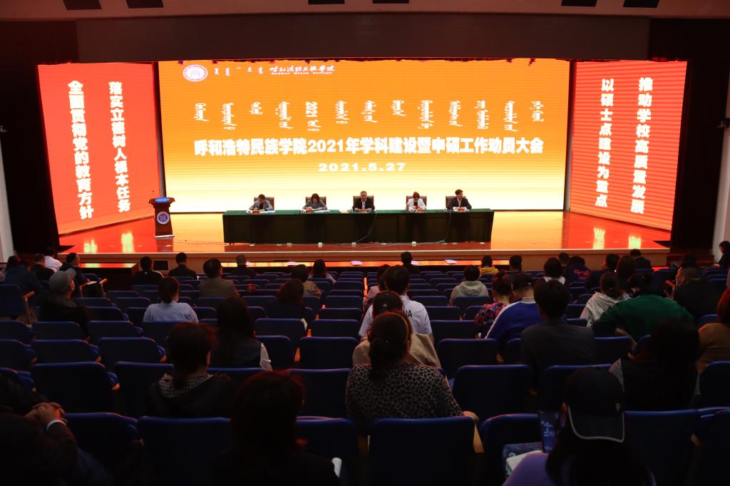 在中国共产党建党一百周年,在“十四五”开局之年,在深入开展党史学习教育之际,为深入贯彻党的十九届五中全会精神,贯彻落实以习近平同志为核心的党中央着眼高等教育“十四五”及长远发展的战略部署,充分认识学科建设的重要意义,统一思想,凝聚共识,为2023年突破硕士点打基础、鼓士气、开新局,5月27日下午,学校在图书馆二楼报告厅召开2021年学科建设暨申硕工作动员大会。自治区教育厅学位管理与研究生教育处负责人席东民,党委副书记、校长格日乐图,党委副书记胡春梅,副校长纳丽娜,党委委员、副校长高喜天出席会议。学校副处级以上干部、教研室主任、教学科研办公室主任、正高级职称人员、博士(含在读博士生)、学科带头人、骨干教师代表等近260人参加了会议。会议由党委委员、副校长韩伟新主持。