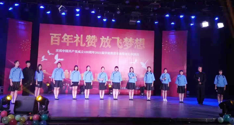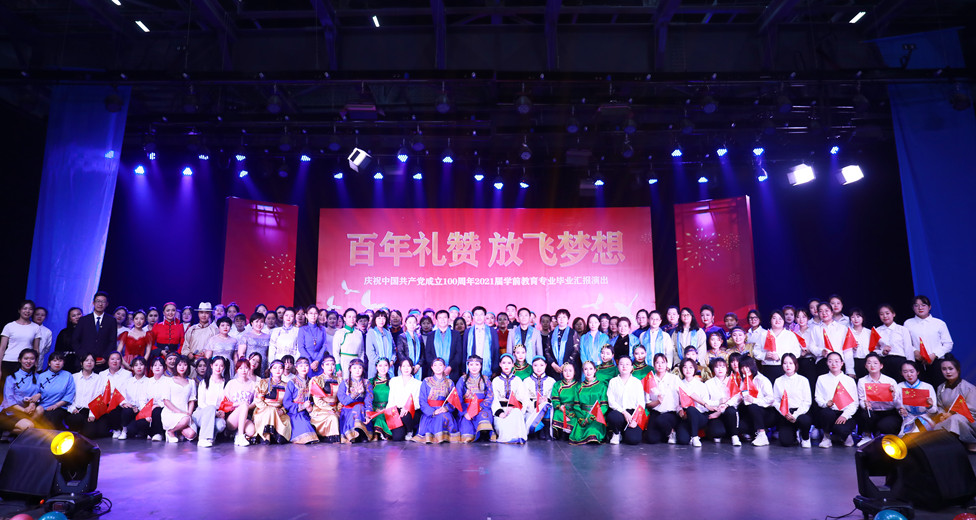 为庆祝中国共产党成立100周年,学前教育学院于5月27日晚在学校演播厅举办“百年礼赞 放飞梦想”2021届毕业生汇报晚会。学校韩伟新副校长、高喜天副校长、部分部门负责人、呼和浩特市蒙古族幼儿园(南园)园长乌日勒格、新城区第一幼儿园园长计爽、新城区第二幼儿园园长王煜彤、吾乐贵育儿园园长乌尼尔其其格、呼和浩特市政府机关幼儿园教研组组长王晓琴、新城区第十五幼儿园副园长呼日雅拉图及部分幼儿园骨干教师代表、学前教育学院历届优秀毕业生代表出席晚会,学前教育学院全体教师、学生代表观看晚会。此次汇演中,学前教育学院的学子充分展现专业素养,汇报了专业学习成果,并对学校和老师的培养表达了深深的感谢。