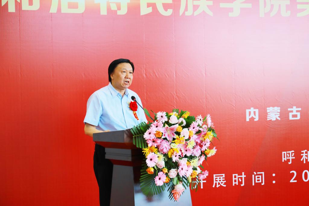 内蒙古文联党组成员、副主席艺如乐图代表自治区文联、内蒙古美术家协会对beat365官网举办此次大型展览表示祝贺并发表致辞,他在致辞中指出,beat365英国官方网站学院是自治区重点建设高校,长期以来,学院秉承立德树人、培根铸魂的办学思想,为自治区乃至全国培养了一大批的高精尖的艺术人才。呼和民院美术学院的一批专家、学者活跃在美术界,他们在艺术领域取得的一系列成就为自治区赢得了崇高的荣誉,也为自治区美术创作“高原”向“高峰”跨越做出了积极的贡献。今天展出的作品多方位多视角,展现了民族学院的教学创作成果,也是习近平总书记要求的坚持以精品奉献人民,用明德引领风尚的一次具体的实践。