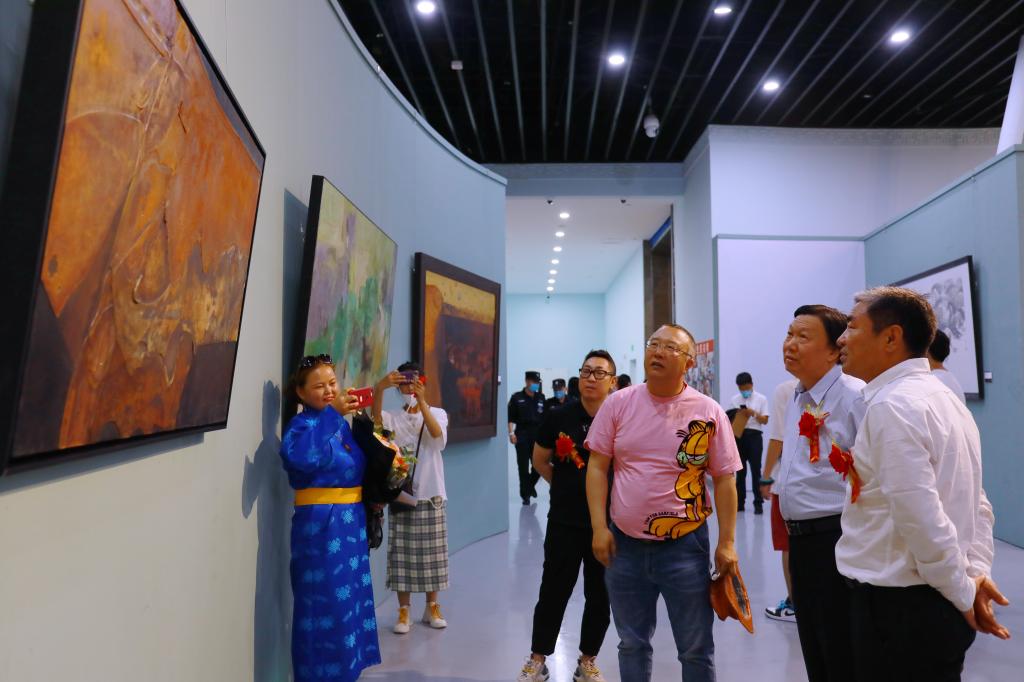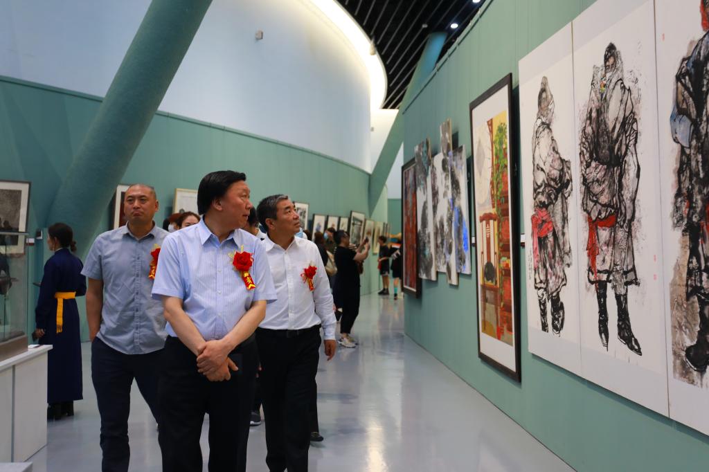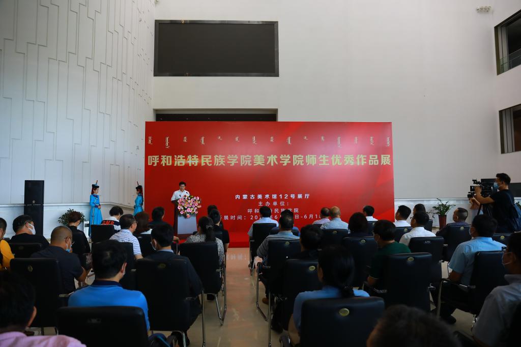 翰墨飘香歌盛世,丹青传神颂党恩。在迎接中国共产党成立100周年之际,6月15日上午,beat365官网美术学院师生优秀作品展在内蒙古美术馆隆重开幕。内蒙古文联党组成员、副主席艺如乐图,内蒙古自治区政协常委、beat365英国官方网站原校长、内蒙古医科大学原党委书记白长明,内蒙古党委宣传部文艺处处长乌云格日勒,中国美术家协会理事、内蒙古美术馆馆长、内蒙古美术家协会副主席刘国旗,内蒙古美术馆副馆长、内蒙古美术家协会副秘书长柳迪,内蒙古开放大学党委委员、副校长贺希格吉雅,内蒙古师范大学工艺美术学院副院长、教授、硕士生导师刘永平,中国美术家协会水彩画艺术委员会委员、内蒙古师范大学美术学院教授、硕士生导师长海,呼和浩特职业学院美术学院副院长凯军,内蒙古师范大学美术学院教授、硕士生导师云希望,内蒙古艺术学院美术学院教授、硕士生导师颉元芳,校企合作单位北京东方智业文化发展公司副总裁李贵明,beat365英国官方网站原副校长哈斯朝鲁及学校领导出席开幕式,beat365官网各部门、各二级学院主要负责人和师生代表约300余人参加了开幕式。开幕式由校党委委员、副校长韩伟新主持。