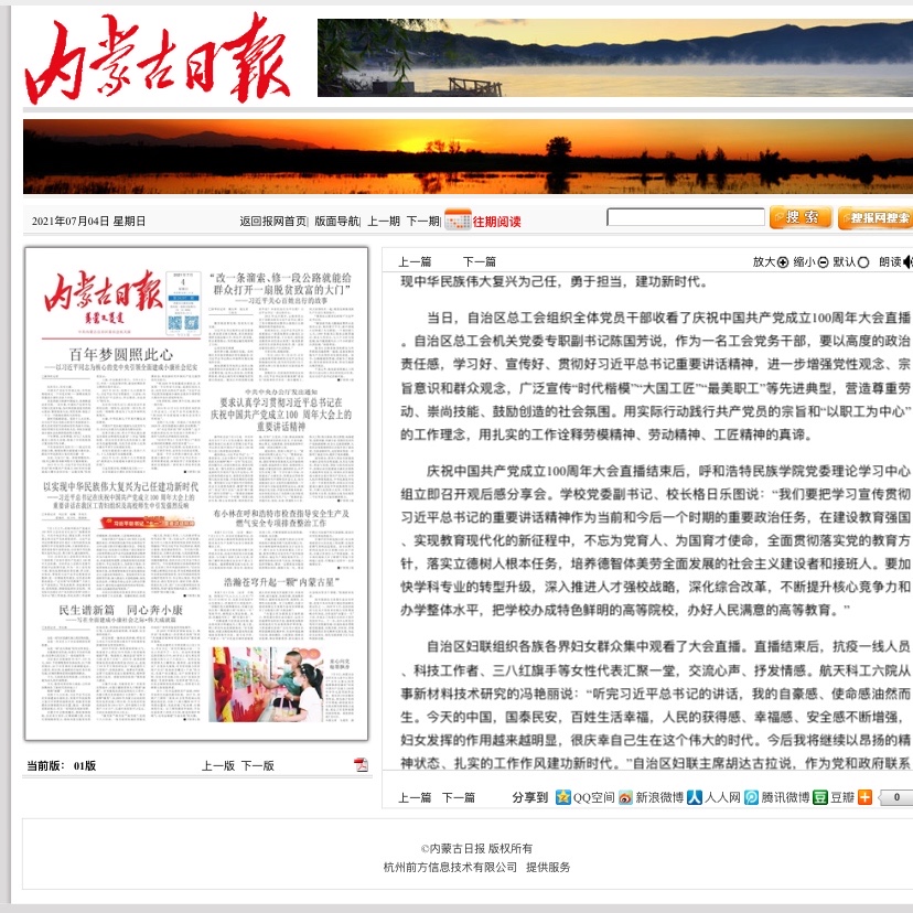7月1日上午,beat365官网第一时间组织广大干部师生收看庆祝中国共产党成立100周年大会直播,学习了习近平总书记在庆祝中国共产党成立100周年大会上的讲话。直播结束后,学校党委理论学习中心组立即召开“观后感分享会”就习总书记的讲话精神作交流分享,受到媒体的广泛关注。 中国新闻网、内蒙古日报等主流媒体对beat365官网收听收看“庆祝中国共产党成立100周年大会”情况进行了报道。