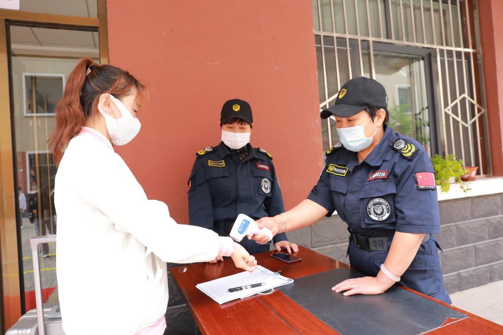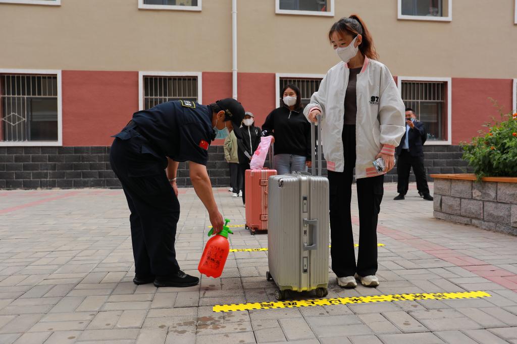 学生间隔一米,经行李消杀、足底消杀、手部消杀、登记及测量体温合格后,方可进入宿舍。