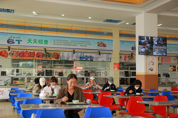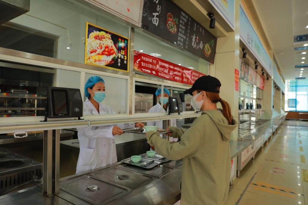 学生间隔一米,经测温通道、手部消杀,依次排队进入食堂。进入食堂后,需间隔一米,排队打饭,错位就坐用餐。