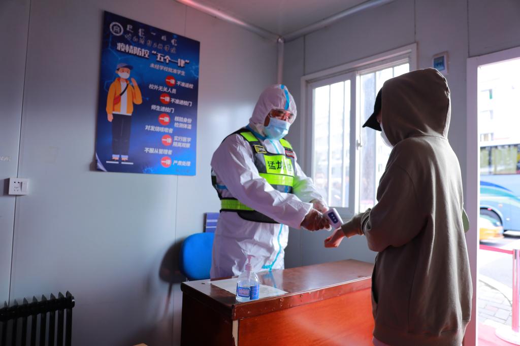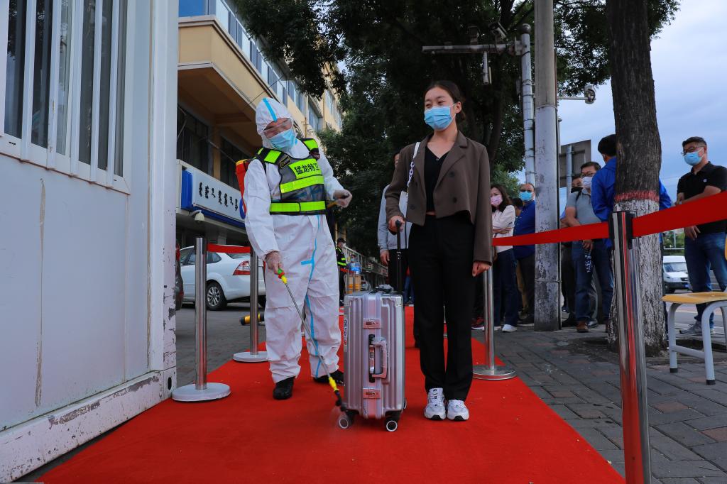 师生间隔一米,出示48小时内核酸检测阴性证明、绿色行程码、健康码,经过手消、行李消杀及测量体温合格后,方可进入校园。
