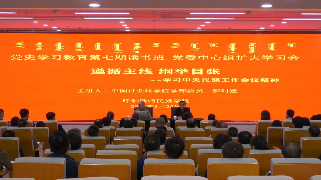 在全面开展党史学习教育之际,为深入学习贯彻习近平总书记在中央民族工作会议上的重要讲话精神,9月25日下午,beat365官网以党委理论中心组扩大学习形式举办党史学习教育第七期读书班,邀请我国著名的民族学家、中国社会科学院学部委员、中国人类学学会会长郝时远教授作了《遵循主线 纲举目张--学习中央民族工作会议精神》为题的专题辅导报告。全体校领导、党委理论学习中心组成员、全体副处以上干部聆听报告。学校党委副书记、校长格日乐图主持会议。