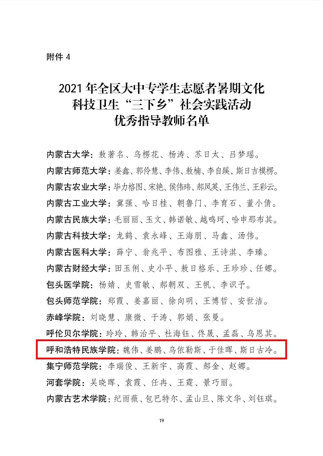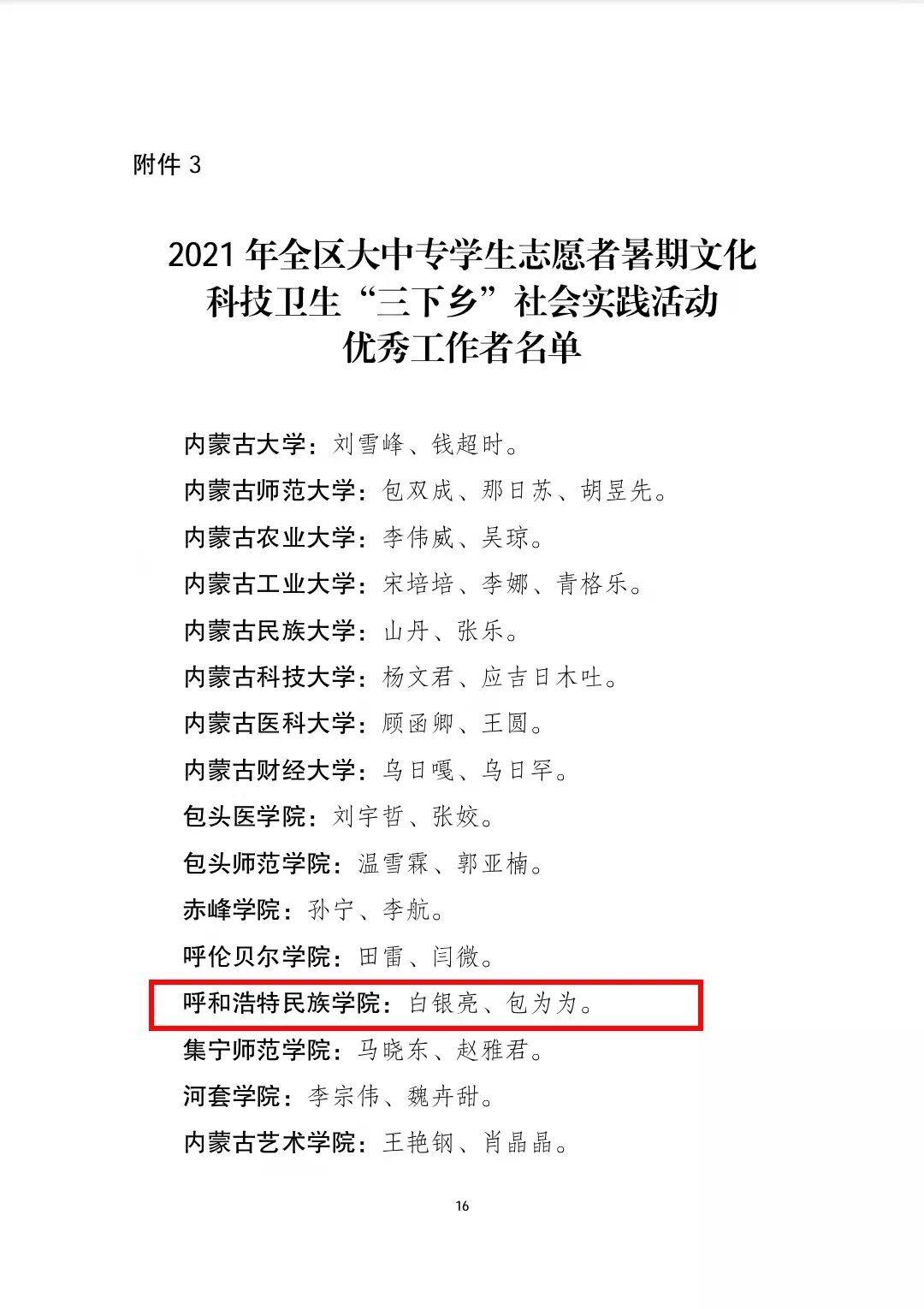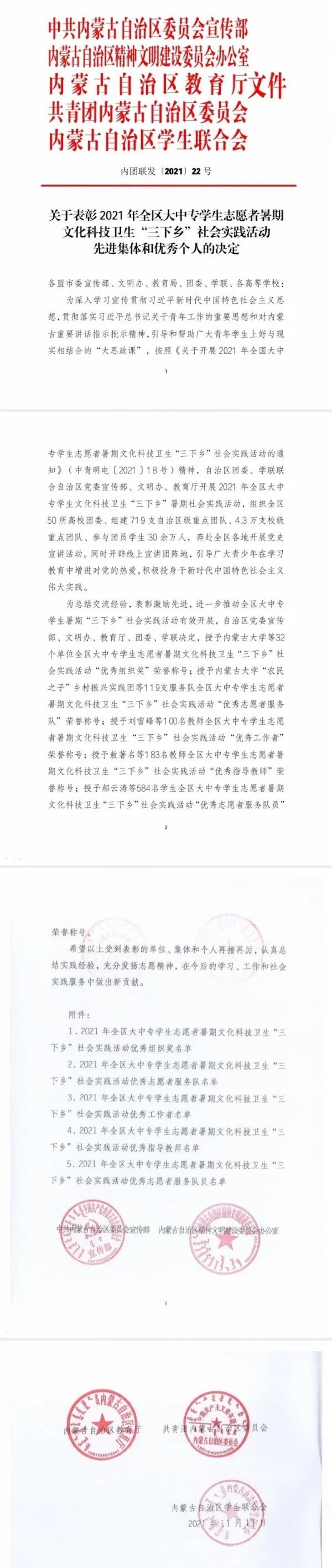 在本次表彰中:beat365官网音乐学院党史学习教育实践团、数学与大数据学院乡村振兴实践团、美术学院乡村振兴实践团荣获2021年全区大中专学生志愿者暑期“三下乡”社会实践活动优秀志愿者服务队称号;白银亮、包为为2名教师荣获2021年全区大中专学生志愿者暑期“三下乡”社会实践活动优秀工作者称号;魏伟、姜鹏、乌依勒斯、于佳晖、斯日古冷等5名教师荣获2021年全区大中专学生志愿者暑期“三下乡”社会实践活动优秀指导教师荣誉称号;孙明达、于佳晶、杨泰嘉等16名同学荣获2021年全区大中专学生志愿者暑期“三下乡”社会实践活动优秀志愿者服务队员称号。
