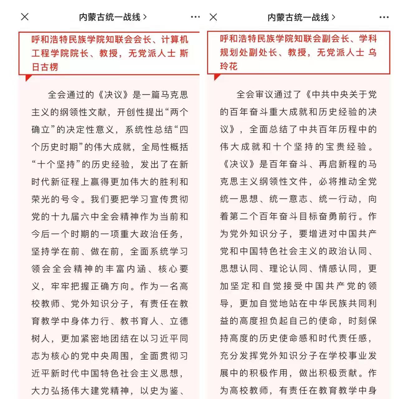 学习会后,党外知识分子在钉钉群内交流了学习心得。内蒙古统一战线在微信公众号对斯日古楞、乌玲花老师的学习心得进行了推送。
