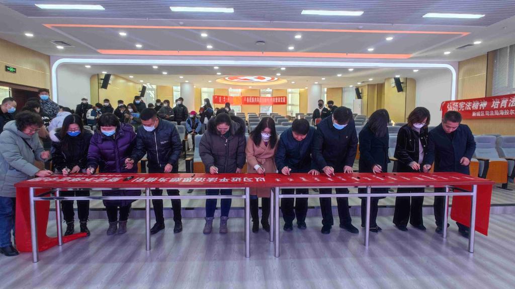 本次活动的主题是“以习近平法治思想为指引,坚定不移走中国特色社会主义法治道路”,旨在推动干部师生制度意识,依宪依法依规履职,做制度执行的表率。在学校图书馆一楼报告厅,由领学人员对《中华人民共和国宪法》进行了导学,带领全体人员面向宪法宣誓,并在宣传横幅上签名,做出了庄严而神圣的承诺。随后,参会人员共同观看了宪法主题宣传片《 宪法的诞生》,对宪法的诞生、宪法的地位作用、设立宪法日的目的等内容进行了学习。最后,新城区民委、司法局向学校师生赠送了《中华人民共和国民法典》《中华人民共和国法律援助法》《内蒙古自治区实施<中华人民共和国国家通用语言文字法>办法》《内蒙古自治区促进民族团结进步条例》等法律法规共计1000余册。