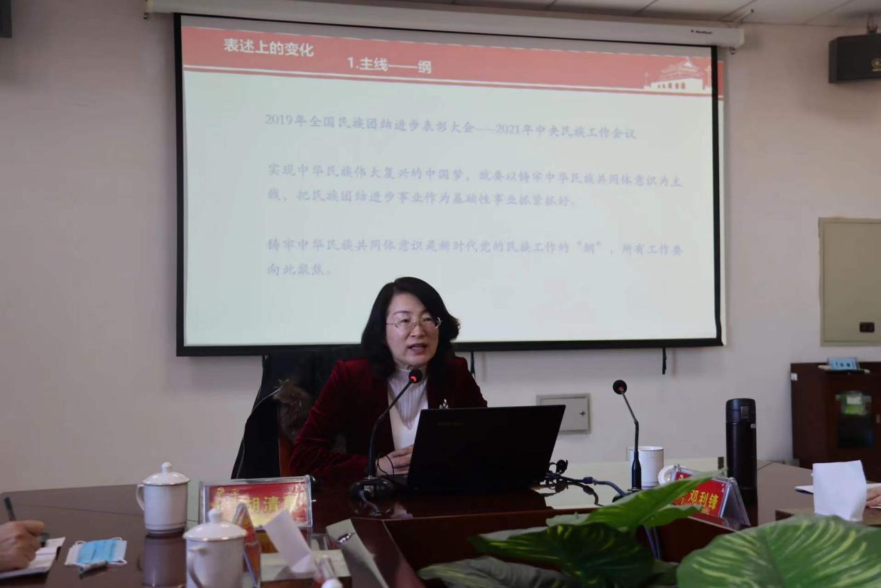 胡清惠教授以“关于中央民族工作会议精神的几点思考”为题,围绕中央民族工作有关新思想、新论断、新提法,我们党关于加强和改进民族工作的重要思想体系的内在逻辑,深刻理解和把握铸牢中华民族共同体意识的重大意义,立足基本国情民族工作创新发展要正确把握“四对关系”,铸牢中华民族共同体意识为主线推动新时代民族工作高质量发展等五个方面展开了深入系统的讲解。