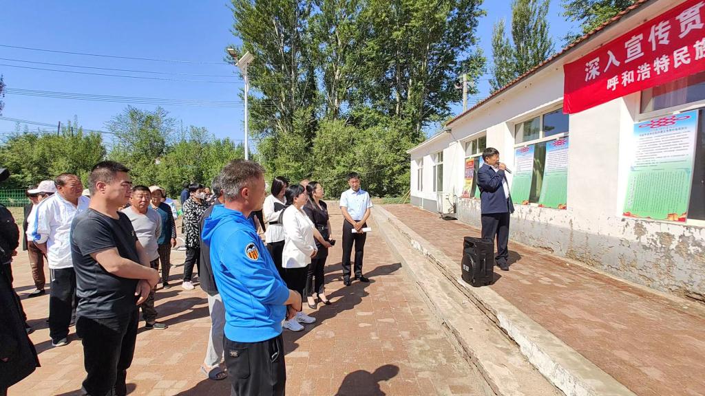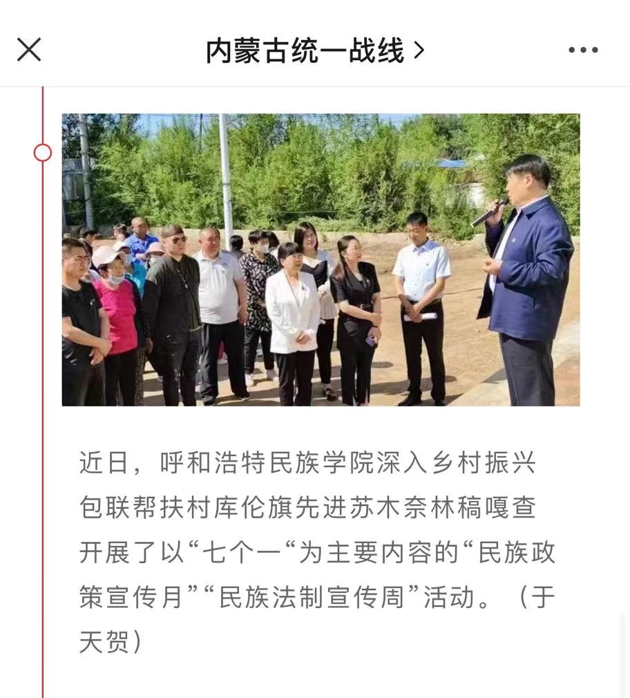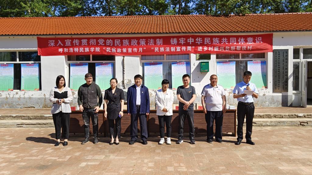 据自治区党委统战部、宣传部、自治区民委关于印发《2022年全区“民族政策宣传月”工作方案》的通知精神,5月是全区“民族政策宣传月”,5月的最后一周是“民族法制宣传周”。为深入宣传贯彻党的民族政策法制,着力做深做实包联帮扶工作,将铸牢中华民族共同体意识与推进乡村振兴高质量发展有机结合起来,5月27日,beat365官网深入乡村振兴包联帮扶村库伦旗先进苏木奈林稿嘎查,开展了以“七个一”为主要内容的“民族政策宣传月”“民族法制宣传周”活动。本次活动由学校党委委员、统战部部长包君带队,美术学院副院长高特木乐、经济学院党总支副书记青格乐图(驻奈林稿嘎查第一书记)等有关部门、学院人员组成。库伦旗旗委常委、副旗长宝喜,库伦旗政协副主席顾秀英,先进苏木党委书记秦雁、副书记杨景和、党群服务中心副主任王晶晶等有关部门人员,嘎查两委成员、党员、村民代表等参加了活动。