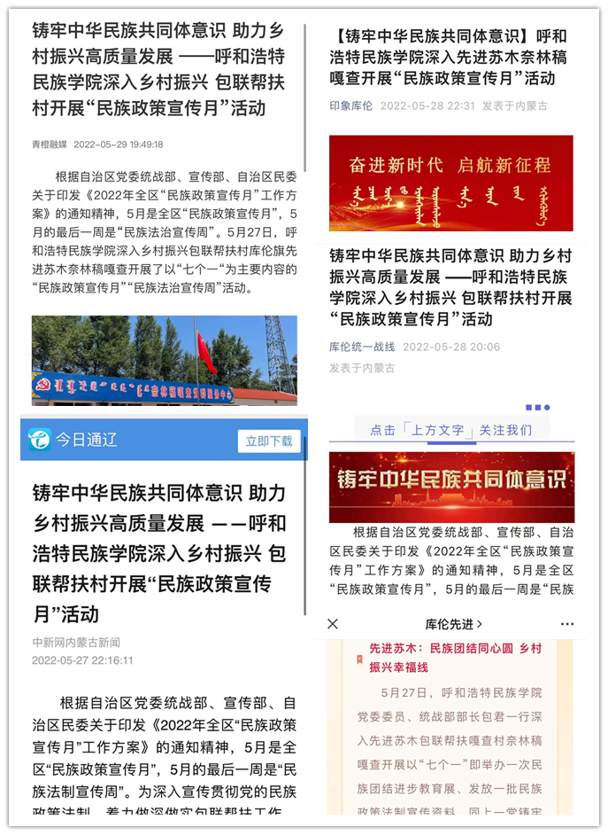 截至目前,本次活动得到了中国新闻网、内蒙古统一战线、内蒙古教育发布、正北方网、青橙融媒、今日通辽、库伦统一战线、印象库伦、库伦先进等13家新闻媒体和官方媒体的大力宣传报道,使beat365官网“民族政策宣传月”“民族法制宣传周”和乡村振兴包联帮扶工作取得了实效、扩大了影响。