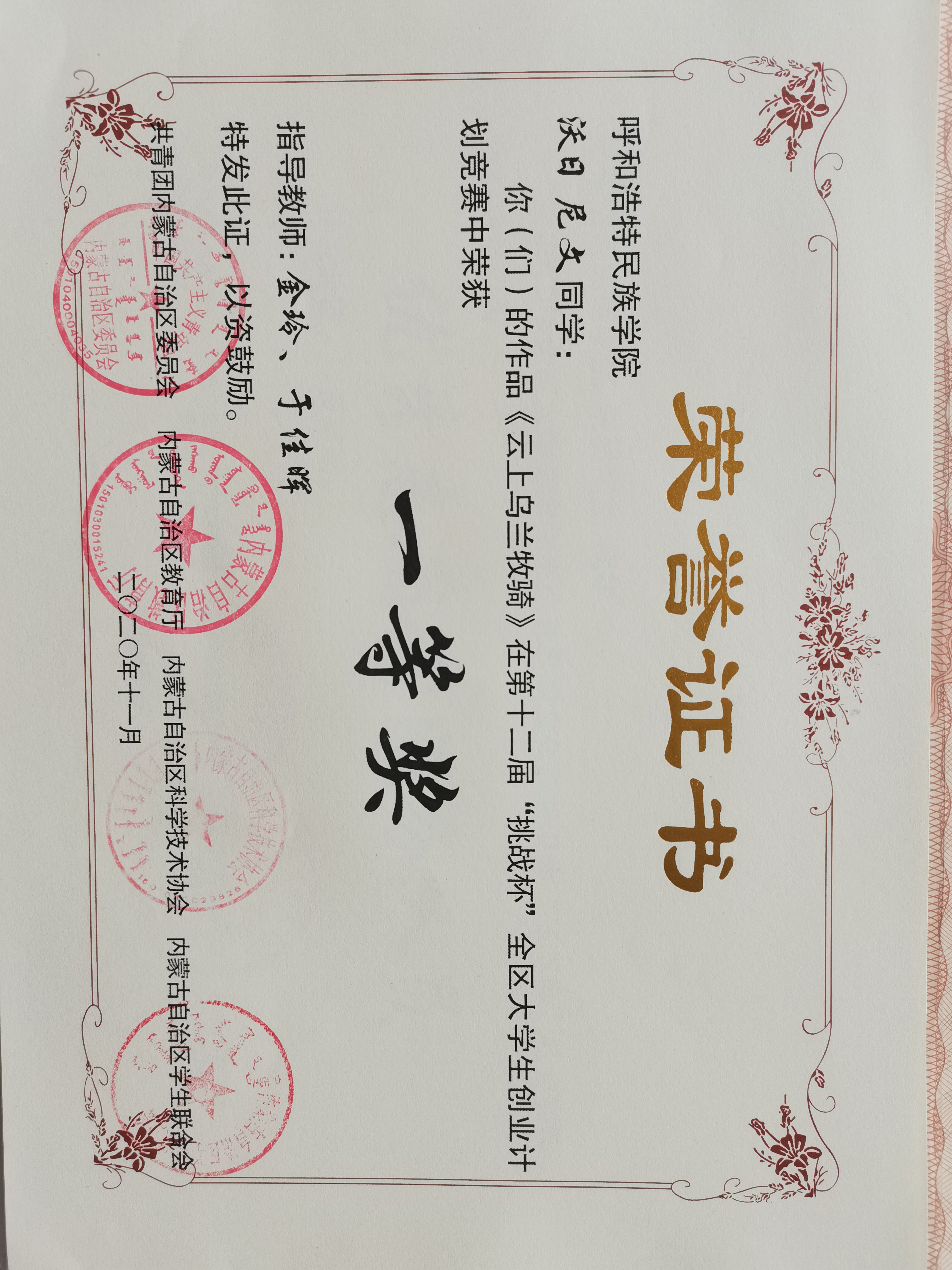 参与一项国家级大学生创新创业训练计划项目、主持一项自治区级大学生创新创业训练计划项目、参与一项自治区级大学生创新创业训练计划项目。获得“建行杯”第五届内蒙古自治区互联网+大学生创新创业大赛铜奖、“建行杯”第六届内蒙古自治区互联网+大学生创新创业大赛金奖、第十二届“挑战杯”全区大学生创业计划竞赛本科组一等奖、beat365英国官方网站第六届互联网+大学生创新创业大赛一、二、三等奖、第十三届"认证杯"数学中国数学建模网络挑战赛三等奖、第九届小美赛数学建模国际赛二等奖、第十三届"认证杯"数学中国数学建模网络挑战赛优秀奖等奖项。