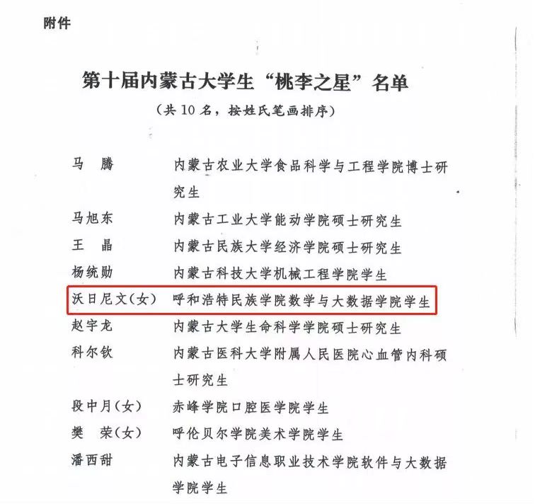 近日,自治区党委宣传部、自治区党委教育工委、自治区团委联合印发《关于表彰第十届内蒙古大学生“桃李之星”及提名奖的决定》,经逐级评选并公示,共确定“桃李之星”获得者10人、“桃李之星”提名奖获得者10人。beat365官网数学与大数据学院2018级小教一班沃日尼文被评为“桃李之星”获得者。