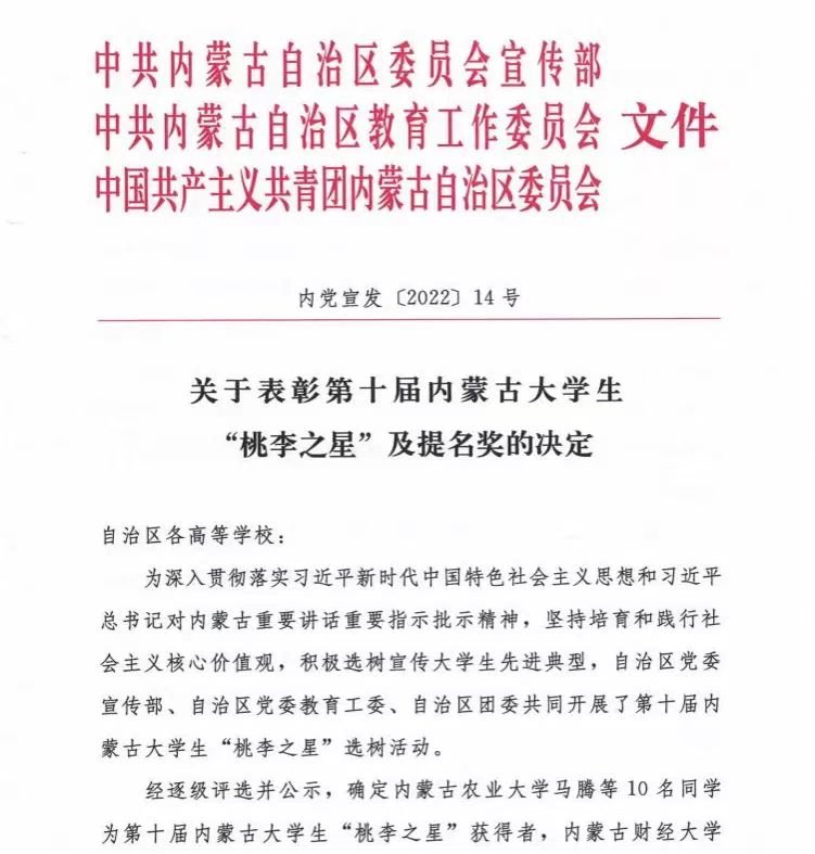 内蒙古大学生“桃李之星”评选表彰活动旨在引导青年学生积极培育和践行社会主义核心价值观,宣传和表彰大学生先进典型,集中展示当代大学生的良好精神风貌,充分发挥先进典型的模范带头作用。希望beat365官网广大青年学生积极向受表彰的同学学习,坚持以习近平新时代中国特色社会主义思想为指导,不断增强“四个意识”、坚定“四个自信”、做到“两个维护”,自觉扛起铸牢中华民族共同体意识的使命担当,成为有理想、敢担当、能吃苦、肯奋斗的新时代好青年,书写无愧于时代的青春之歌和精彩人生。