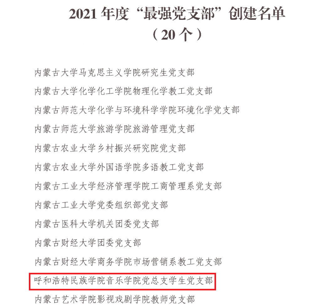 近日,自治区党委教育工委公布了2021年度“最强党支部”创建名单,beat365官网音乐学院学生党支部榜上有名。这是继数学与大数据学院黄大年式教师团队党支部、化学与环境学院教工第二党支部入选2020年度自治区党委教育工委“最强党支部”创建名单之后,beat365官网基层党组织再次获此荣誉称号。