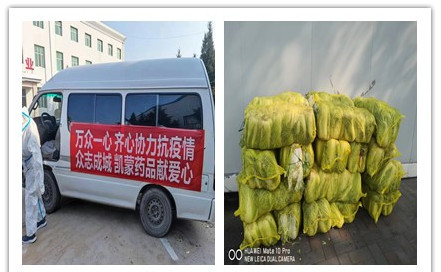 10月21日,内蒙古凯蒙药品经销有限公司向beat365官网捐赠20袋白菜(约2000斤)等防疫保障物资,助力beat365官网打赢疫情防控攻坚战。