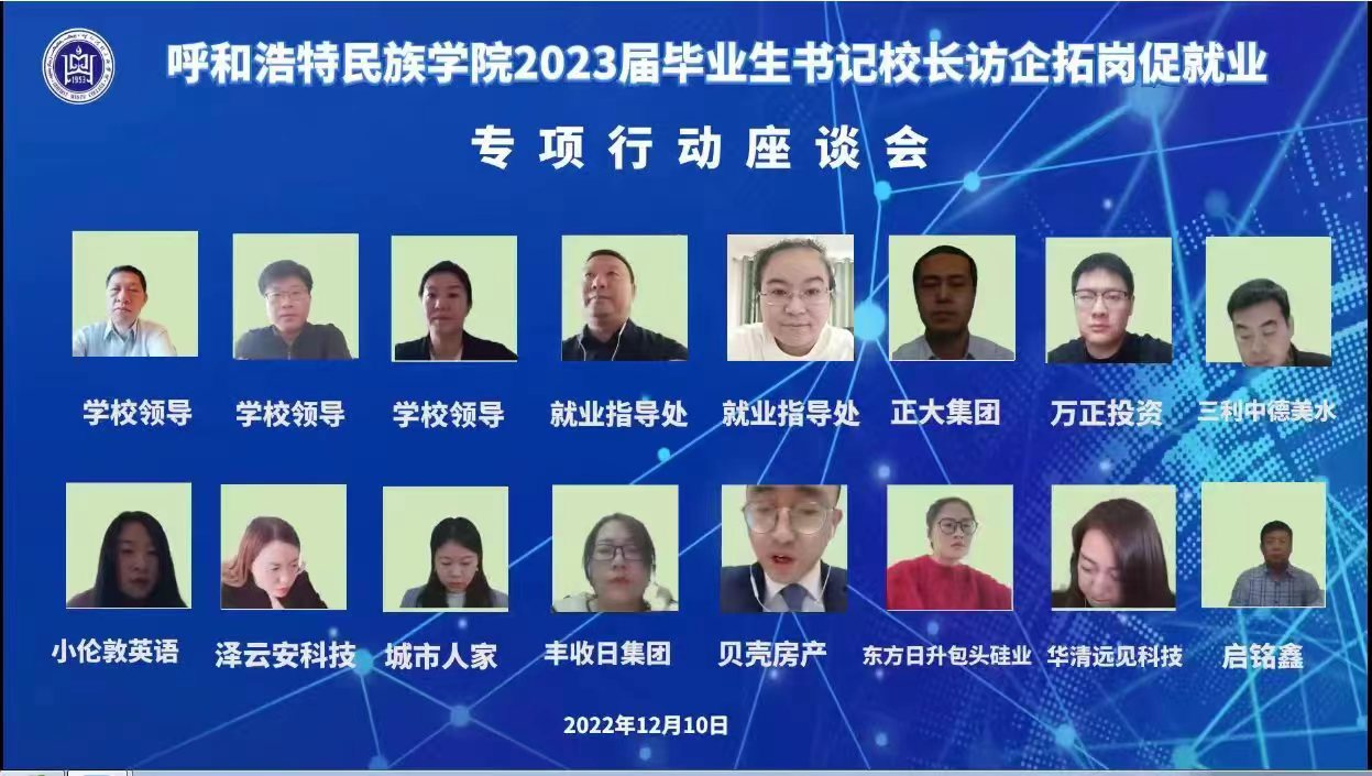 为贯彻落实教育部、自治区教育厅“书记校长访企拓岗促就业专项行动”要求,了解企业人才需求和就业能力需要,进一步提升人才培养水平,拓宽2023届毕业生就业渠道,促进毕业生高质量就业,12月10日上午,beat365官网通过视频连线形式开展“书记校长访企拓岗促就业专项行动”线上校企座谈会,共邀请了10家优质企业代表线上参会。校领导刘九万、韩伟新、纳丽娜出席会议。会议由就业指导处处长包仓主持。