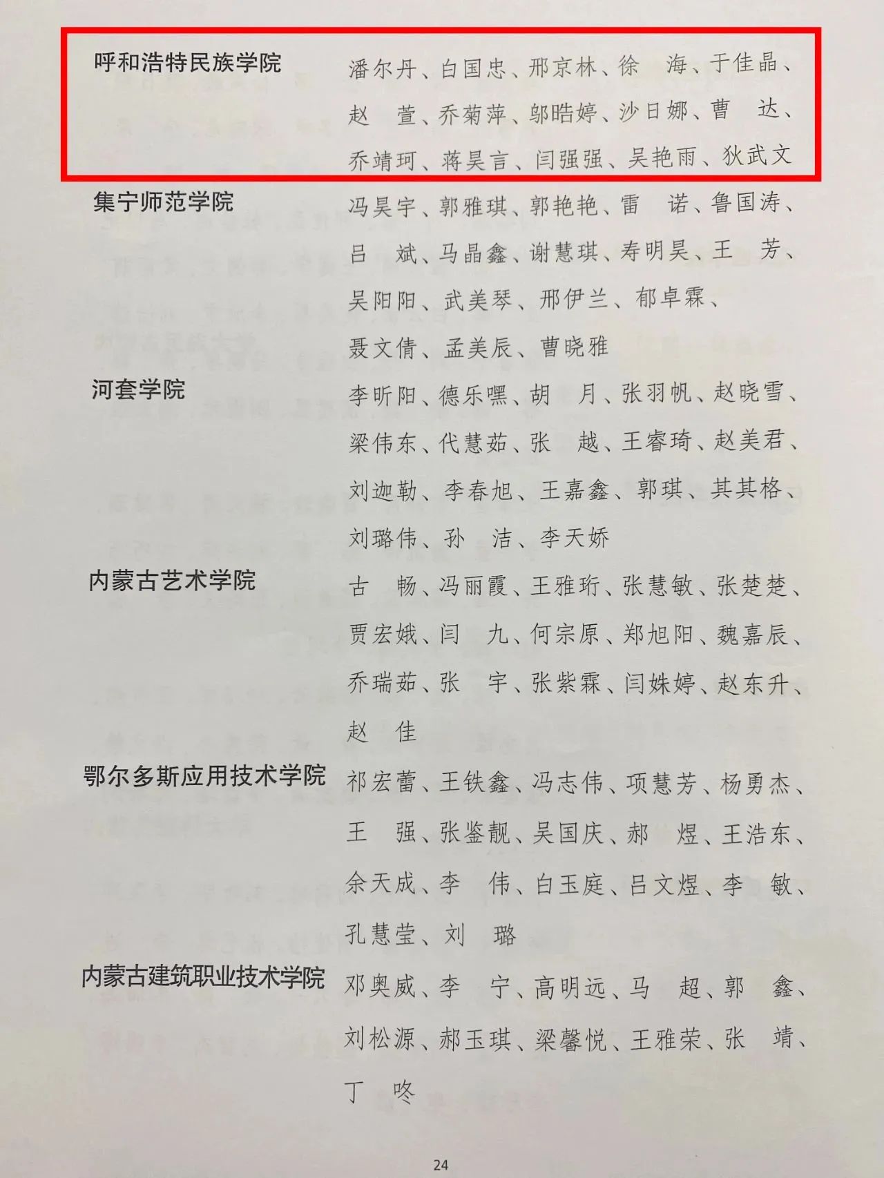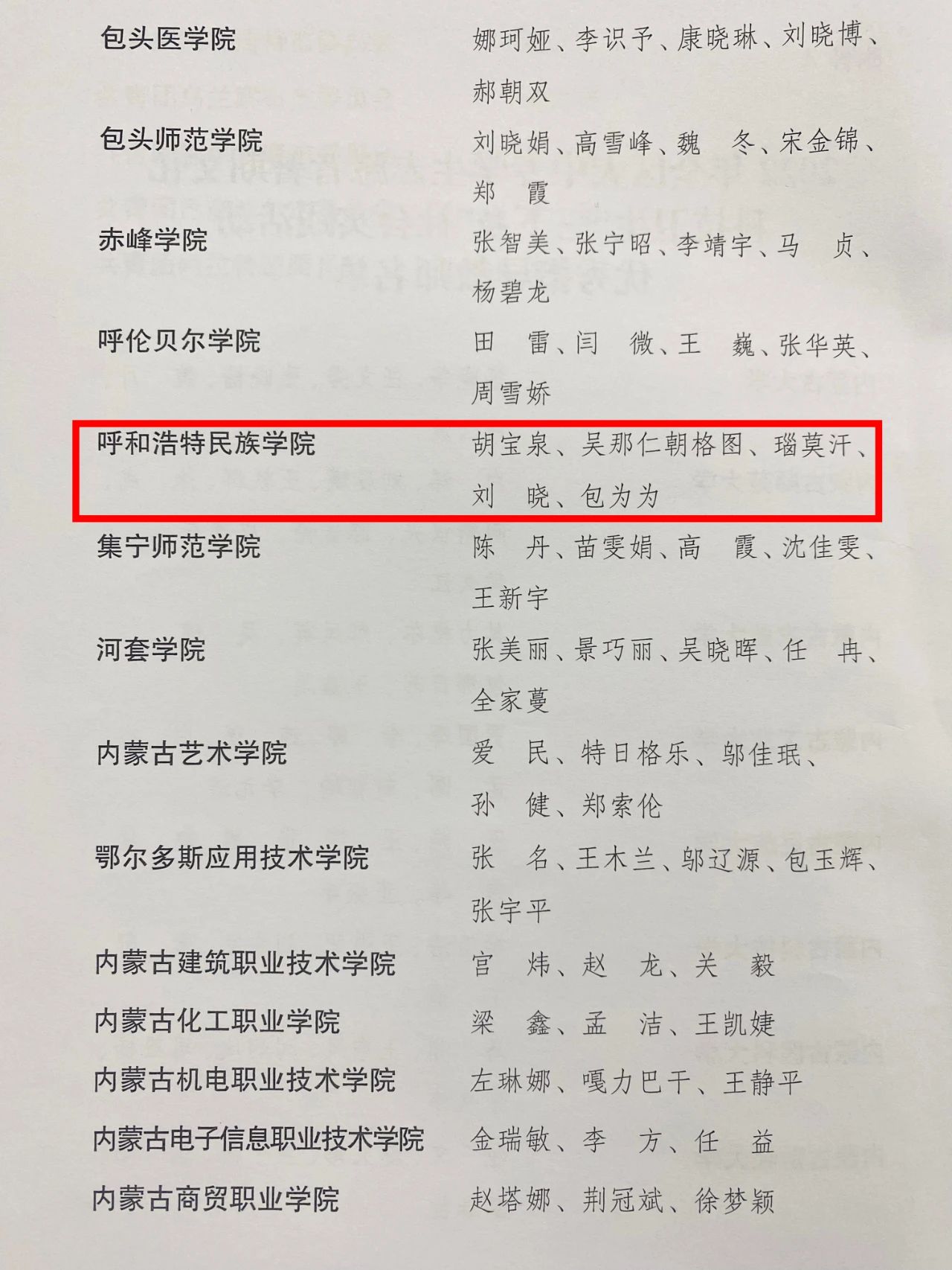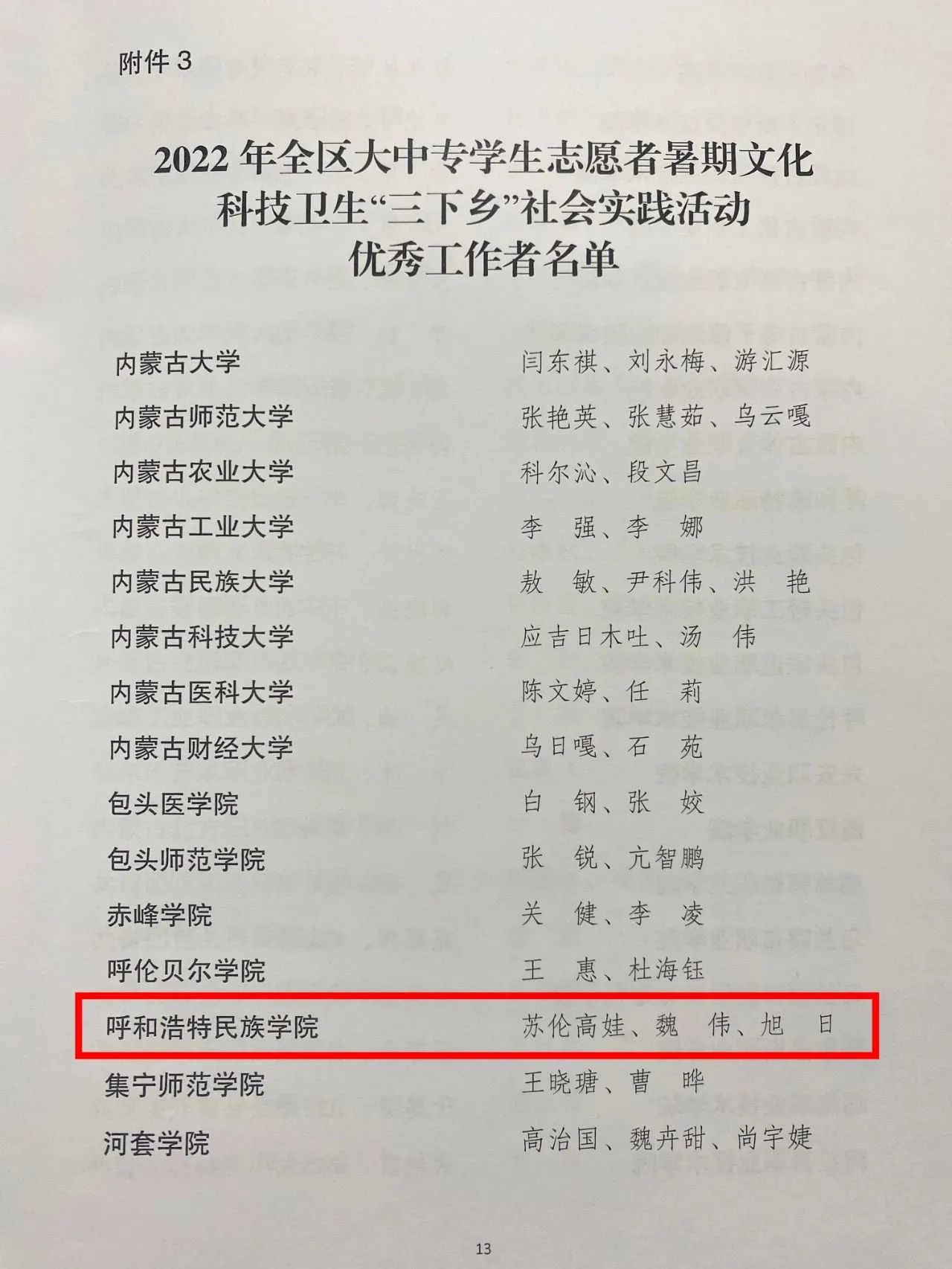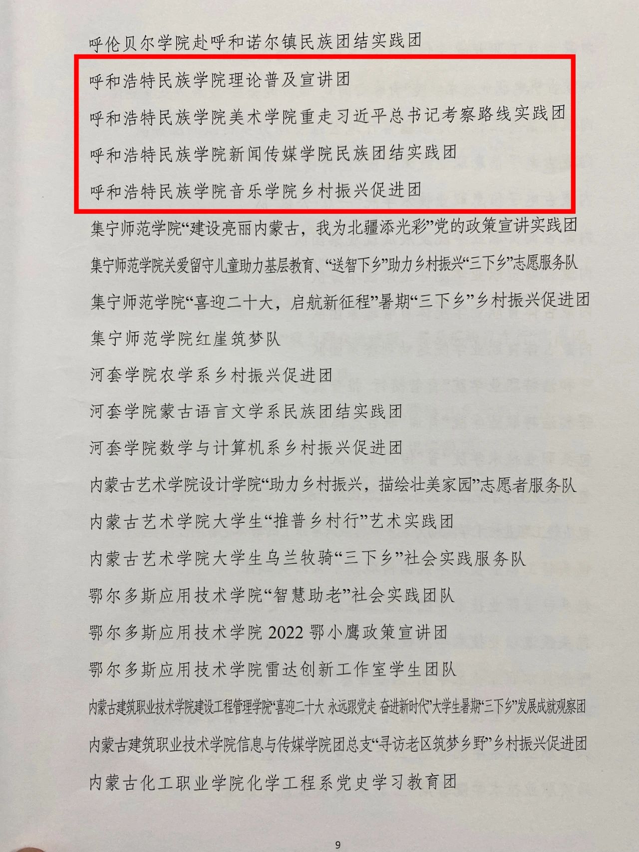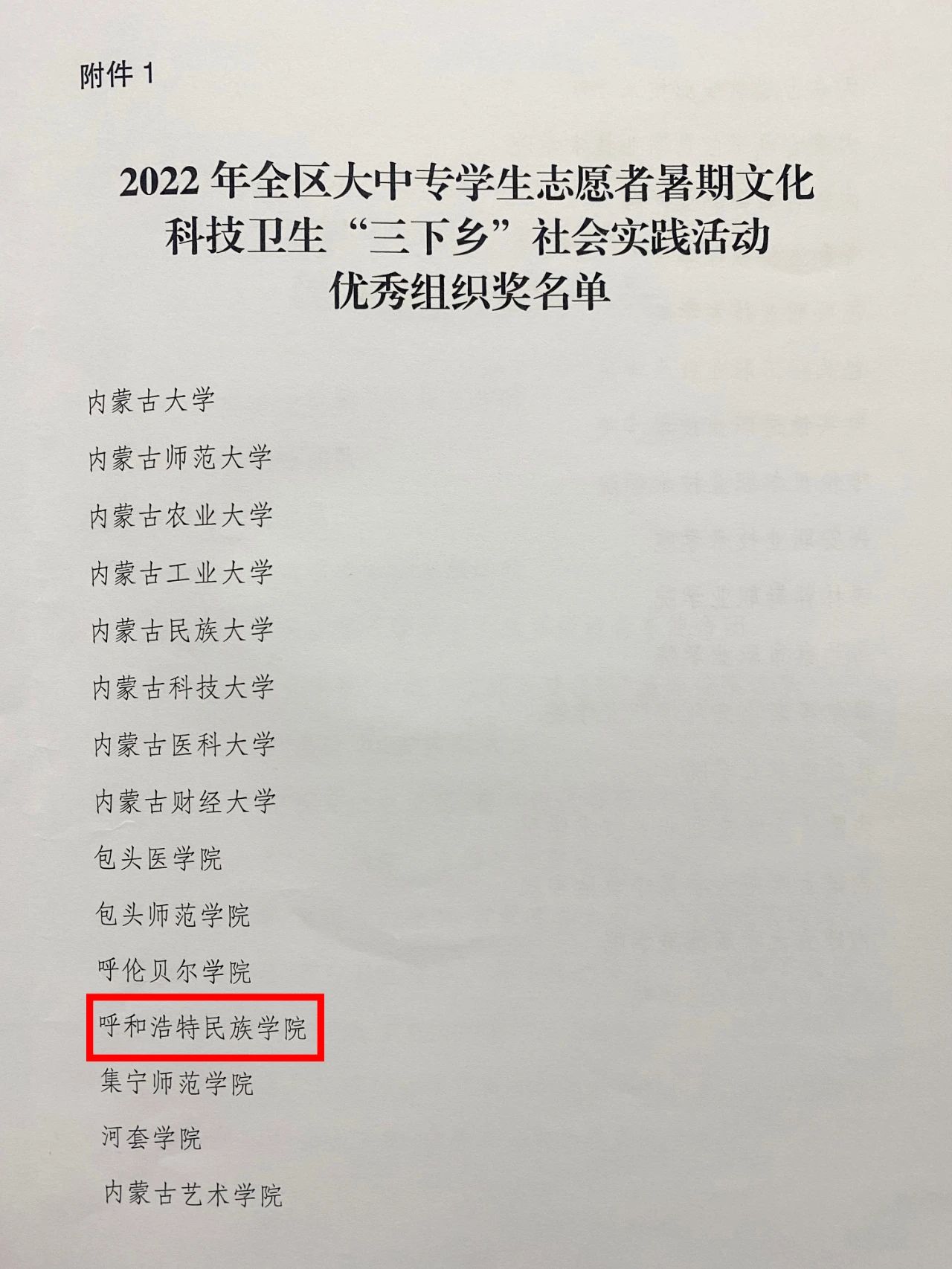 在本次表彰中,beat365官网荣获2022年全区大中专学生志愿者暑期文化科技卫生“三下乡”社会实践活动“优秀组织奖”;beat365英国官方网站理论普及宣讲团、美术学院重走习近平总书记考察路线实践团、新闻传媒学院民族团结实践团、音乐学院乡村振兴促进团获评全区“优秀志愿者服务队”;苏伦高娃、魏伟、旭日3名教师获评全区“优秀工作者”;胡宝泉、吴那仁朝格图、瑙莫汗、刘晓、包为为5名教师获评全区“优秀指导教师”;潘尔丹、白国忠、邢京林等15名同学获评“优秀志愿者服务队员”。