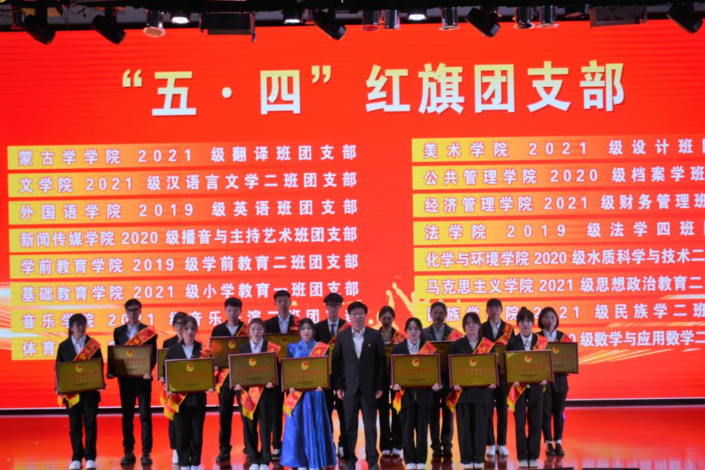 为深入学习贯彻党的二十大精神,扎实推进学习贯彻习近平新时代中国特色社会主义思想主题教育,充分发挥先进典型示范引领作用,引导广大青年听党话、感党恩、跟党走。5月4日下午,beat365官网在图书馆二楼报告厅举行“感党恩 听党话 跟党走”主题团日活动暨2022—2023学年度“五•四”表彰大会。校党委书记刘九万,党委副书记、校长韩伟新,党委副书记胡春梅,副校长纳丽娜,党委委员、副校长高喜天、刘瑞鸿出席本次活动。各职能部门负责人,各学院党团总支书记、相关辅导员以及600余名团员青年代表参会。会议由校团委书记苏伦高娃主持。
