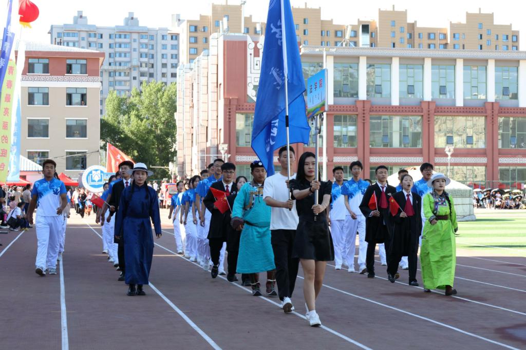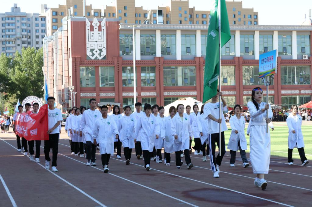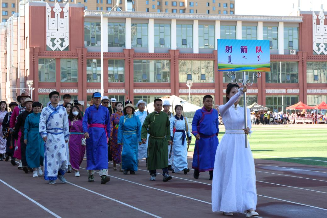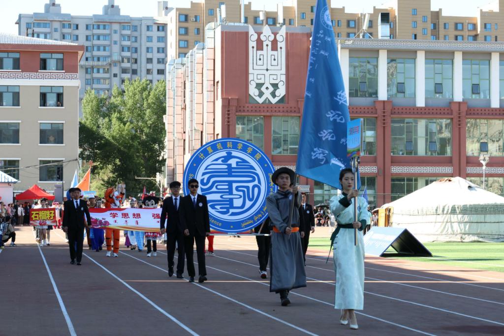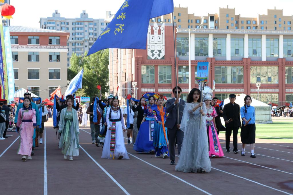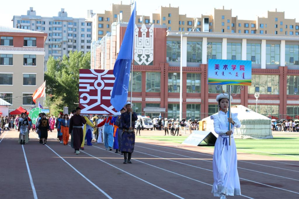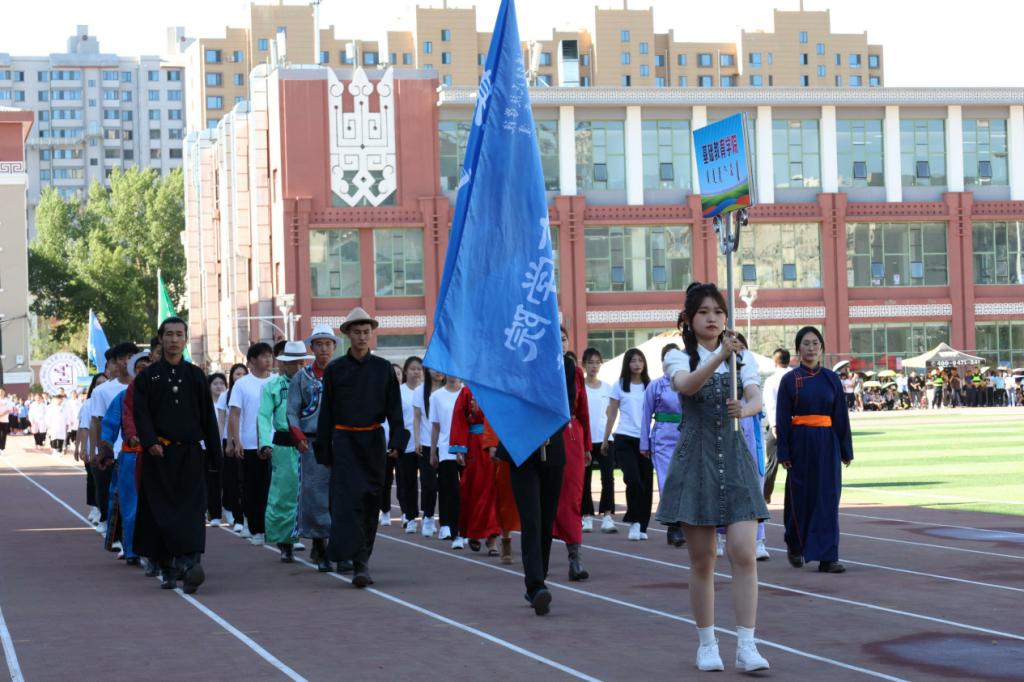 马背彩旗队、石榴籽小课堂方阵、传统武术队以及身着特色服装的搏克代表队、射箭代表队、布鲁代表队、喜塔尔代表队、蒙古象棋代表队、包根吉日格代表队、沙嘎哈日靶代表队、抢枢代表队等传统项目队和各学院代表方队依次入场。他们步伐健朗,整齐划一,喊着响亮的口号,充分展示了beat365官网师生积极向上的精神风貌。