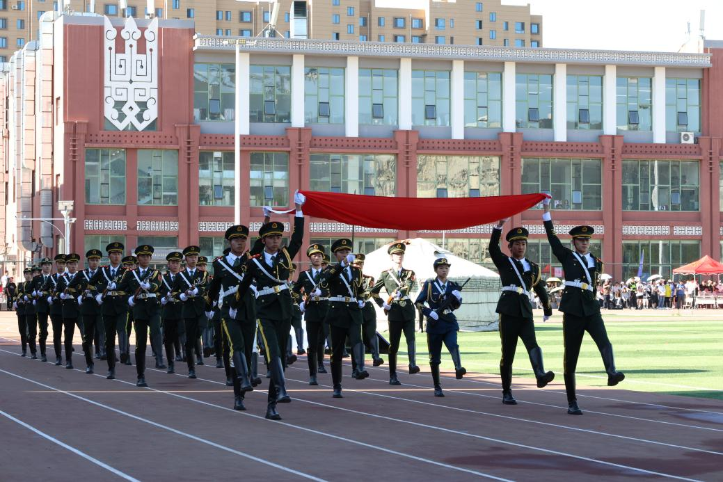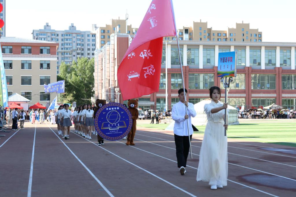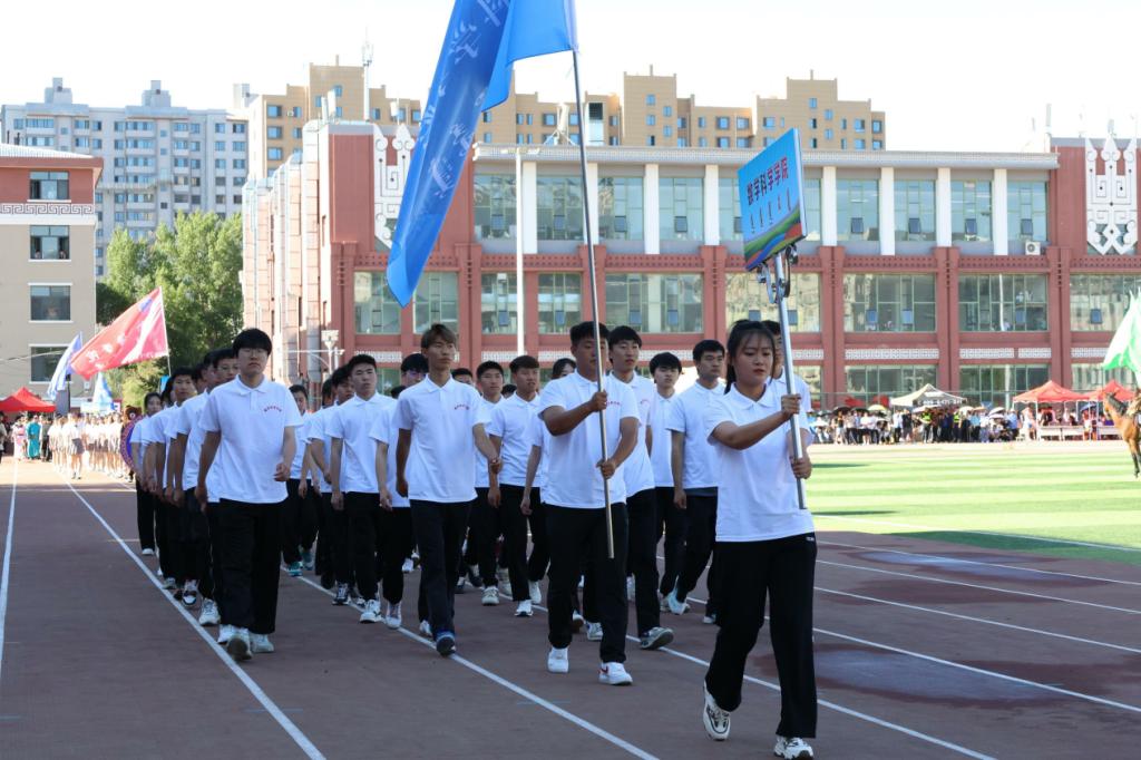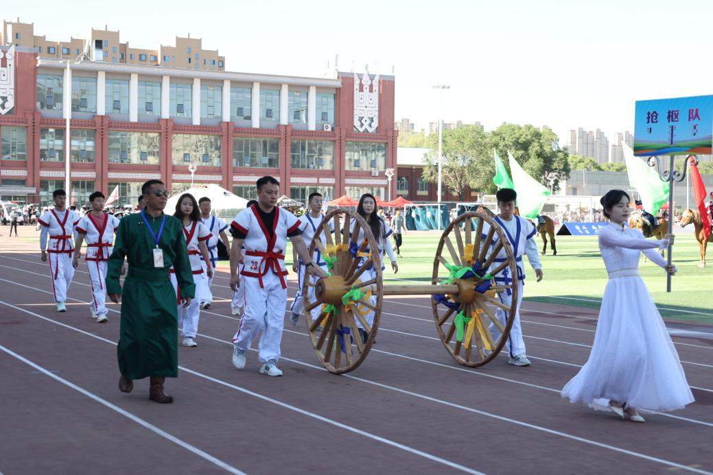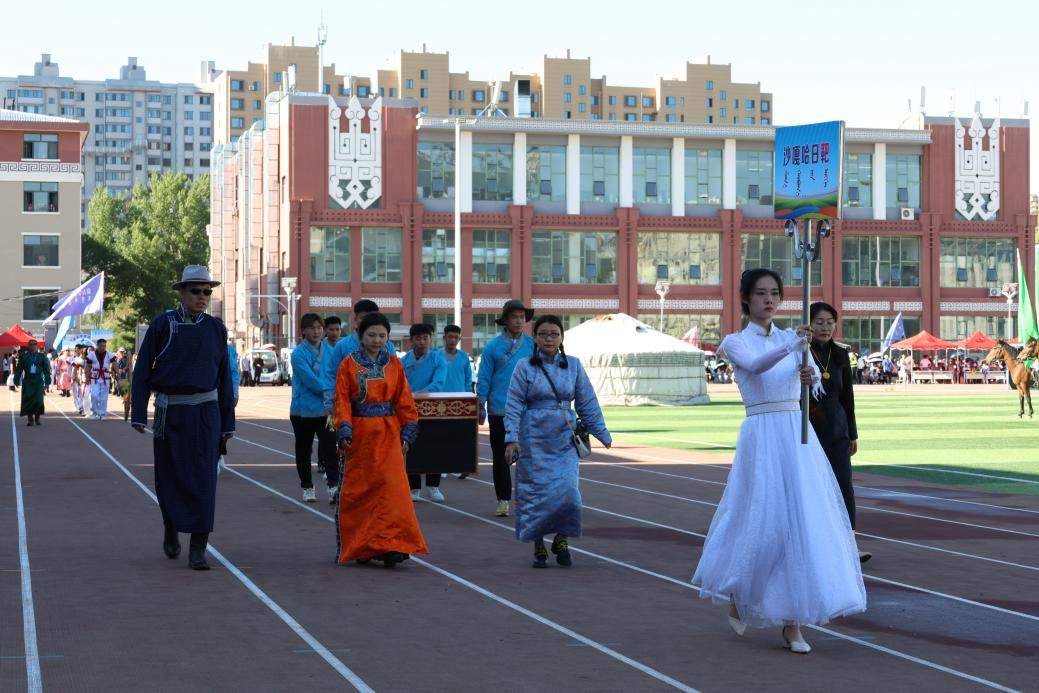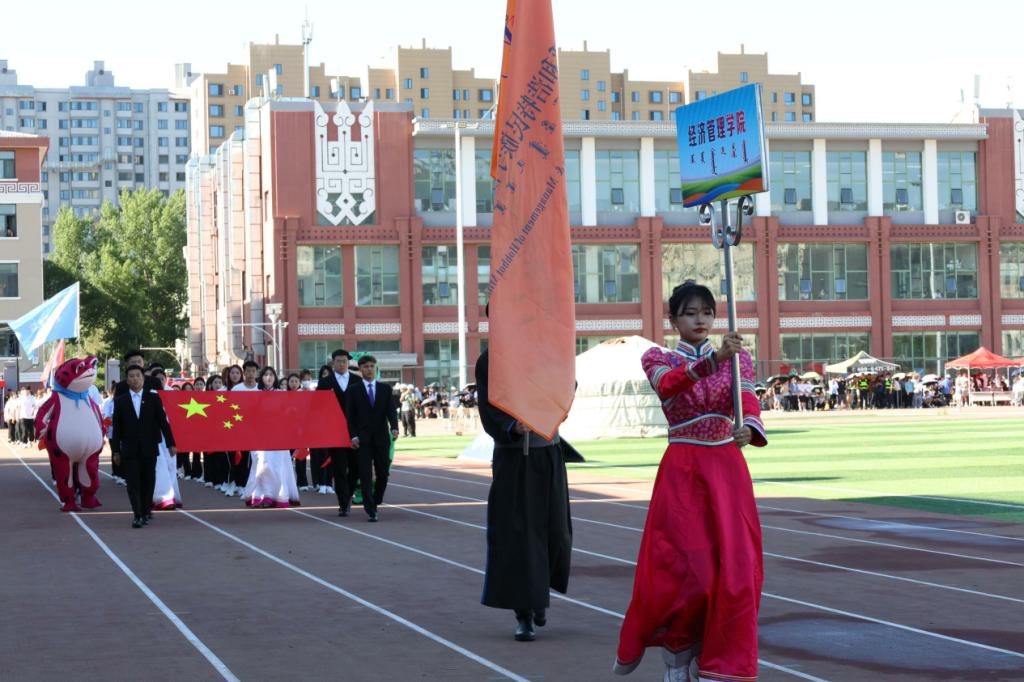 马背彩旗队、石榴籽小课堂方阵、传统武术队以及身着特色服装的搏克代表队、射箭代表队、布鲁代表队、喜塔尔代表队、蒙古象棋代表队、包根吉日格代表队、沙嘎哈日靶代表队、抢枢代表队等传统项目队和各学院代表方队依次入场。他们步伐健朗,整齐划一,喊着响亮的口号,充分展示了beat365官网师生积极向上的精神风貌。