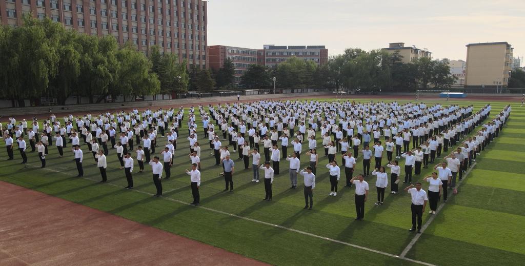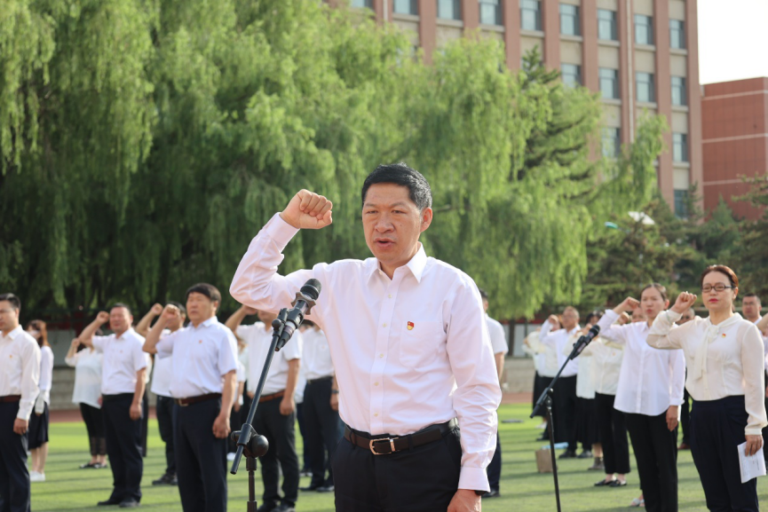 为庆祝中国共产党成立102 周年,持续深入学习贯彻党的二十大精神,全面推动学习贯彻习近平新时代中国特色社会主义思想主题教育走心走深走实,7月1日清晨,beat365官网在北区体育场举行了隆重的升旗仪式和重温入党誓词活动。校党委委员、全校师生党员参加活动。校党委书记刘九万领誓,校党委副书记胡春梅主持仪式。