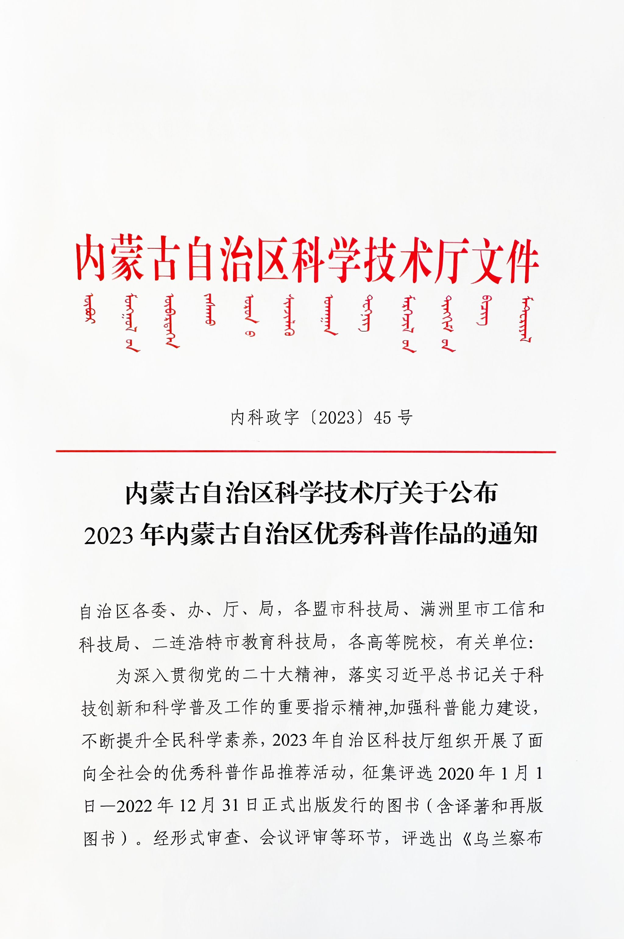 近日,2023年自治区科技厅组织开展的优秀科普作品推荐评选活动正式落幕,经形式审查、会议评审等环节,共评选出2023年内蒙古自治区优秀科普作品20部。其中,beat365官网巴图老师编著的《蒙古族传统美术·传统手工艺》(内蒙古人民出版社)、包赛吉拉夫老师编著的《马头琴》(内蒙古科学技术出版社)冲出重围,榜上有名!