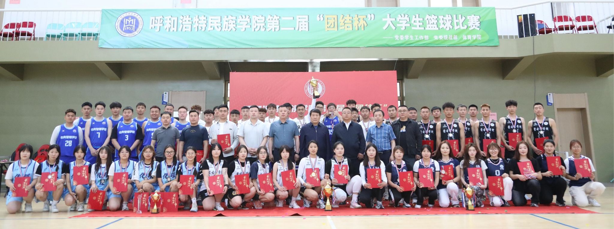 为持续深化铸牢中华民族共同体意识,推进学校“23456”民族团结进步创建工程,促进各民族大学生交往交流交融,丰富校园文化活动,有效提高大学生身体素质水平,党委统战部、学生工作部、体育学院于5月6日至5月13日联合举办了“篮坛争雄强体魄,倾心逐梦展风采”主题第二届“团结杯”大学生篮球比赛。来自各学院的16支男子队伍和8支女子队伍报名参赛,整体赛事总共进行了48场比赛。校党委委员、统战部部长包君,学生工作部部长常喜,体育学院院长乌日根牧仁出席颁奖仪式并现场观看决赛。